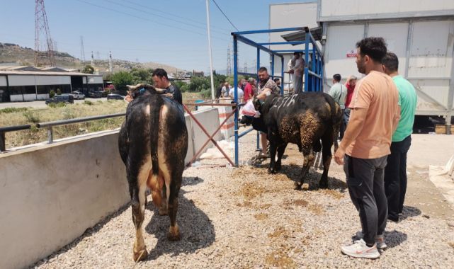 İzmir'de Kurban Bayramı'nın ilk günü kurbanlıkların satışa sunulduğu hayvan pazarlarında yoğunluk yaşanıyor. Bazı vatandaşlar bayramın ilk günü kurbanlık hayvan satın alırken, daha önceden satılan kurbanlıklar içinse yoğun bir kesim sırası yaşanıyor. Hem hayvan pazarlarında kurulan hem de belediyeler tarafından oluşturulan kesim merkezlerinde çalışmalar sabahın erken saatlerinde başlarken, Bornova ilçesi Işıkkent kurban pazarından aldıkları büyükbaş hayvan için pazar yerinde kesim sırası beklediklerini belirten Zafer Öz, “Hayvanı 55 bin liraya aldık. Yaklaşık 300 kilo et çıkacak sanırım. Sabahtan bu yana bir sıra yoğunluğu var. Allah’ın izniyle 15 dakika sonra hayvanımızı keseceğiz. Milletimiz, vatanımız için hayırlı uğurlu olsun” dedi.