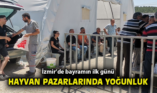 İzmir'de Kurban Bayramı'nın ilk günü kurbanlıkların satışa sunulduğu hayvan pazarlarında yoğunluk yaşanıyor. Bazı vatandaşlar bayramın ilk günü kurbanlıklarını satın alırken, satılan hayvanlar ise yine pazar içerisinde veya belediyeler tarafından kurulan kesimhanelerde kesilerek kurban ibadeti yerine getiriliyor.
