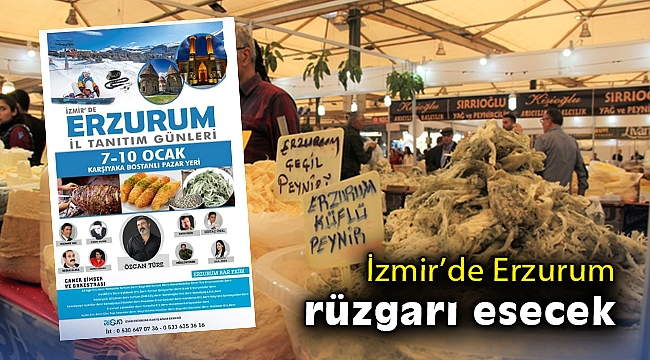 Erzurum İl Tanıtım Günleri etkinlikleri kapsamında Erzurum’un yöresel ürünleri, İzmirlilerle buluşacak. 7-10 Ocak tarihlerinde Bostanlı Pazar Yerinde düzenlenecek olan etkinlikte büyük çoğunluğu Erzurum’dan gelecek birçok firma stant kuracak.