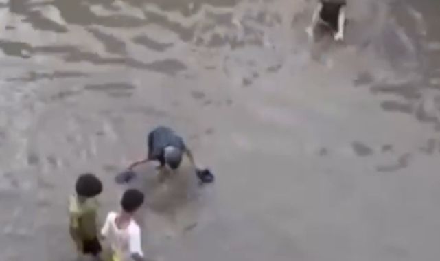 İzmir'de göle dönen sokakta çocuklar yüzdü