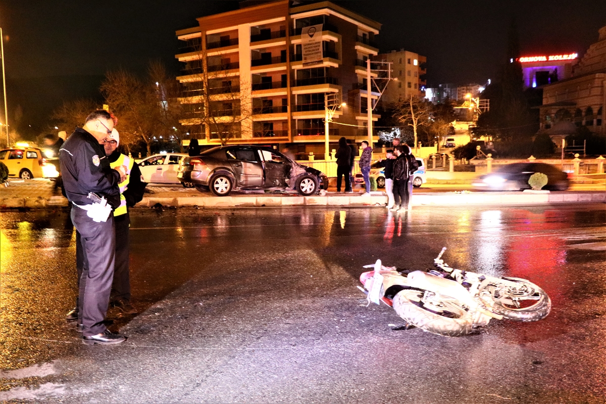 Kazada otomobil çarpmanın etkisiyle refüje savrulurken, motosiklet alev aldı.