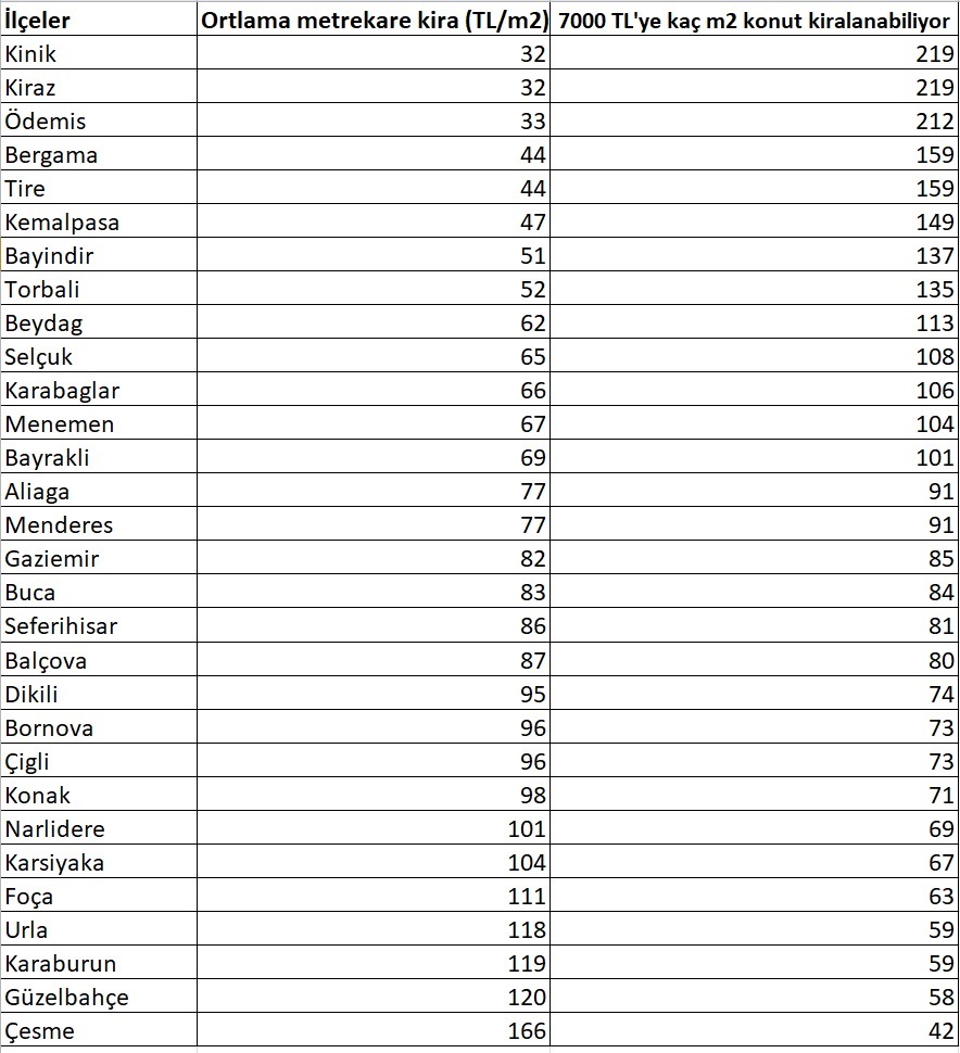 Gayrimenkul değerlemede dijital teknolojilerin gelişmiş olanaklarını kullanan Endeksa, nabzını tuttuğu konut sektörünün ardından şimdi de ‘Kent Kıymet Raporu’ serisi ile illeri mercek altına aldı. Endeksa’nın güncel verilerine göre, yaş ortalaması 38 olan ve nüfusu 5 milyona yaklaşan İzmir’de 2 milyon 174 konut bulunuyor. İzmir’de satılık konutlarda son bir yıllık değer artışı %148 olurken, kiralardaki değer artışı ise %186 olarak gerçekleşti. Endeksa’nın güncel verilerine göre son bir yılda İzmir’in en çok değerlenen ilçesi %195 değer artışı ile Aliağa oldu.İzmir’de konutların ortalama kira bedeli 11 bin 24 TL olurken, ortalama satış fiyatı 2 milyon 816 bin 606 TL oldu. Arsa ve arazi değerlemesinde İzmir en fazla talep gören il olduArsa ve arazi değerlemesinde İzmir en fazla talep gören il olarak ölçüldü. Özellikle yazlık ya da ikinci konutunu yaptırmak isteyenlerin gözdesi olan İzmir’deki arsaların metrekare birim fiyatı 3 bin 951 TL olurken, arazilerin metrekare fiyatı 482 TL oldu. İzmir’deki arsalar son bir yılda %81, araziler %116 değer kazandı. Arsa ve arazi değerleme taleplerinde İzmir’i sırasıyla; İstanbul, Ankara ve Antalya izledi. İzmir'de 7 bin TL'ye hangi ilçeden kaç metrekare konut kiralanabilir?İzmir'de 7 bin TL'ye Ödemiş'ten 212 m2, Kemalpaşa'dan 149 m2, Bergama'dan 159 m2, Bayındır'dan 137 m2, Karabağlar'dan 106 m2, Menemen'de 104 m2, Aliağa'dan 91 m2, Menderes'te 91 m2, Gaziemir'de 85 m2, Dikili'de 74 m2, Bornova'da 73 m2, Karşıyaka'da 67 m2 daire kiralamak mümkün.