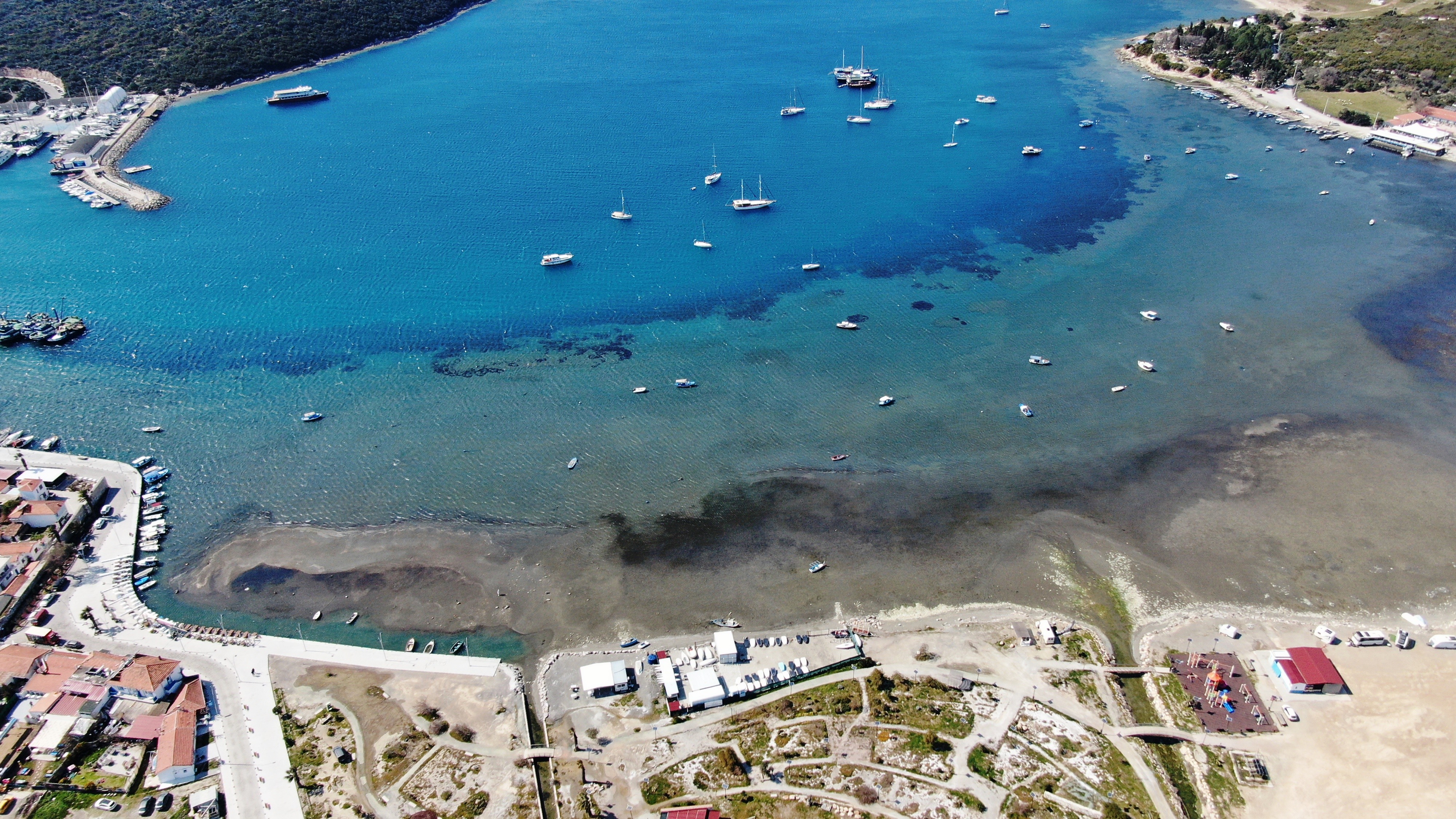 Denizin yer yer 30 metre çekildiği Sığacık sahili ise havadan dronla görüntülendi. Görüntülerde denizin çekilmesiyle oluşan adacıklar görüntülere yansıdı.
