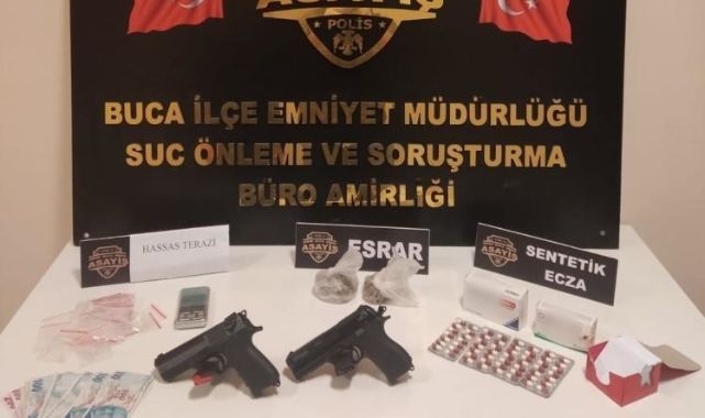 Buca İlçe Emniyet Müdürlüğü Suç Önleme ve Soruşturma Büro Amirliği bünyesinde, tacirlerini yakalamaya yönelik kurulan 'Narko Alan' özel ekibi, ilçedeki zehir tacirlerini bir bir enseliyor. İlçede K.D.B. adında bir kişinin uyuşturucu ticareti yaptığını belirleyen özel polis ekibi, şüpheliyi takip etti. Ardından düğmeye basan ekipler, ilçede bulunan şüphelinin evine operasyon gerçekleştirdi. Adreste yapılan aramada, bir miktar esrar maddesi, 1 hassas terazi, 56 sentetik ecza, 2 ruhsatsız tabanca ve çok sayıda şeffaf kilitli poşet ele geçirildi.