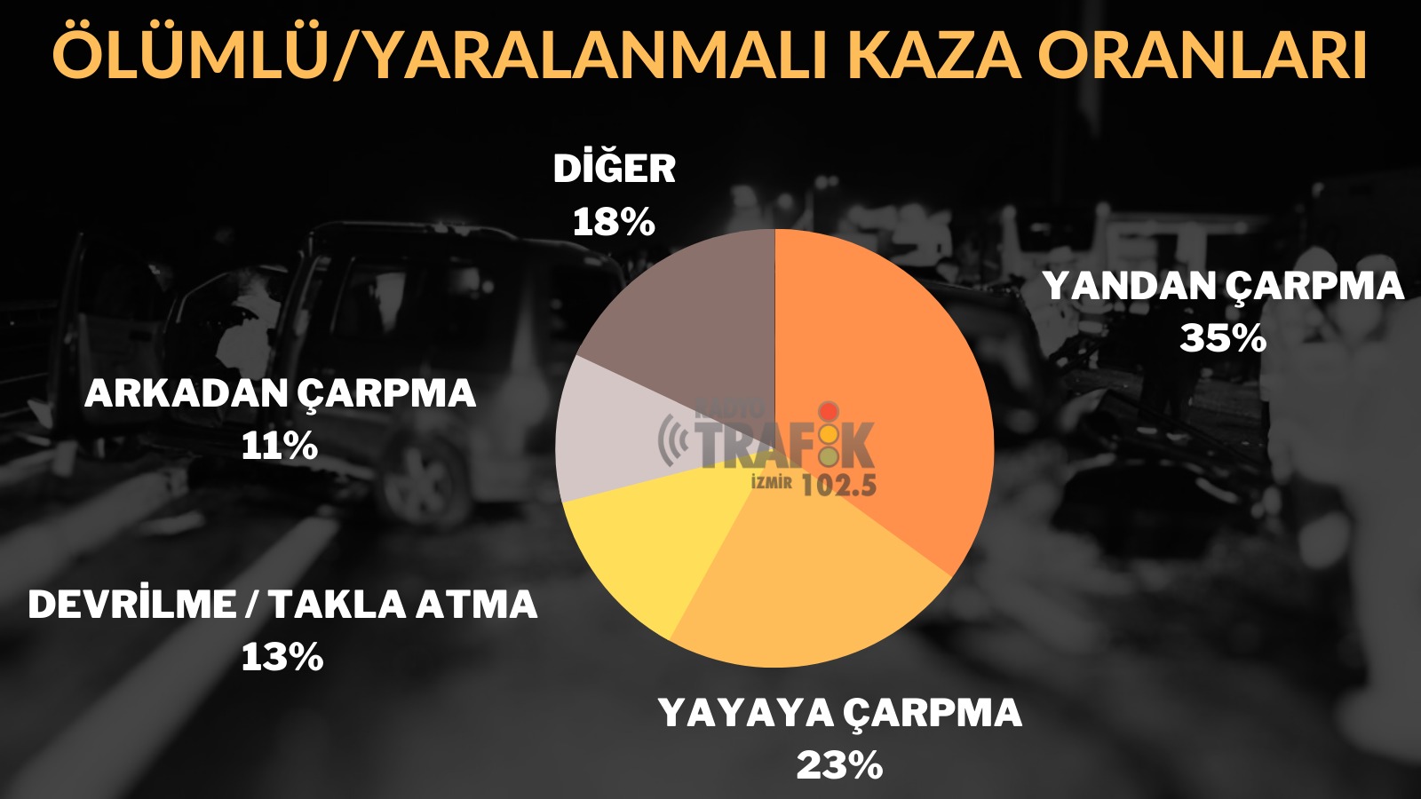 Trafik kazaları her yıl onbinlerce cana mal olurken, yüzbinlerce kişinin de yaralanmasına, hatta engelli kalmasına sebebiyet veriyor. Radyo Trafik İzmir'e konuşan İzmir Emniyet Müdürlüğü Trafikten Sorumlu İl Emniyet Müdür Yardımcısı Şamil Özsagulu, İzmir'de meydana gelen ölümlü ve yaralanmalı trafik kazalarının oluş şekillerine dair önemli bilgiler verdi, vatandaşların dikkat etmesi gereken hususları sıraladı.EN FAZLA ÖLÜMLÜ VE YARALANMALI KAZA YANDAN ÇARPMA SONUCU MEYDANA GELİYORİl genelinde oluşan ölümlü ve yaralanmalı trafik kazalarının yüzde 35’inin yandan çarpma suretiyle olduğunu aktaran Şamil Özsagulu, yayaya çarpma neticesinde oluşan kazaların oranının yüzde 23, devrilme, savrulma ve takla atma sonucu oluşan kazaların oranının yüzde 13, arkadan çarpma suretiyle oluşan kazaların oranının ise yüzde 11 olduğunu belirtti.
