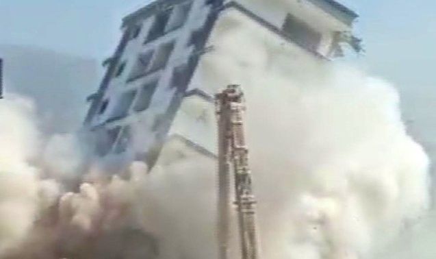 İzmir'de, 30 Ekim 2020'de meydana gelen 6,6 büyüklüğündeki depremde ağır hasar gören ve yıkımı için karar verilen bina, kontrollü yıkım yapılmak istenirken büyük bir gürültüyle çöktü.