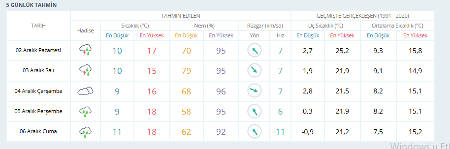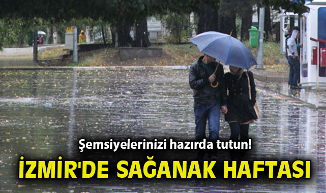 Meteoroloji Genel Müdürlüğü (MGM) İzmir'in haftalık hava durumunu açıkladı. Verilere göre İzmir bu hafta yağmurlu havanın etkisinden çıkamayacak.Haftanın en yüksek sıcaklığı 2 Aralık Pazartesi ve 5 Aralık Perşembe günleri 18 dereceyle olacak, en düşük sıcaklık ise 9 dereceyle 3 Aralık Salı ve 4 Aralık Çarşamba günleri yaşanacak.İşte haftanın hava durumu tablosuMGM'nin açıkladığı tabloya göre İzmir'in 1-6 Aralık hava durumu şu şekilde:1 Aralık Pazar: Gök gürültülü sağanak yağış, 17 derece2 Aralık Pazartesi: Gök gürültülü sağanak yağış, 18 derece3 Aralık Salı: Gök gürültülü sağanak yağış, 9 derece4 Aralık Çarşamba: Çok bulutlu, 9 derece5 Aralık Perşembe: Parçalı bulutlu, 18 derece6 Aralık Cuma: Sağanak yağış, 17 derece