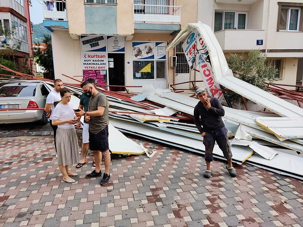 İzmir’de gün içerisinde bir anda başlayan sağanak ve fırtına, hayatı olumsuz etkiledi. Kent merkezi olmak üzere Aliağa, Dikili ve Bergama ilçelerinde etkili olan sağanak ve fırtına hayatı kısa sürede felç ederken, birçok noktada ağaçlar ve direkler devrildi. Araçların üzerine devrilen ağaçlar nedeniyle maddi hasarlar meydana gelirken, kuvvetli rüzgara plajlarda yakalanan vatandaşlar da, apar topar eşyalarını toplayarak güvenli bir yere geçti. Trafikte bulunan vatandaşlar ise şiddetli rüzgar nedeniyle zor anlar yaşadı.