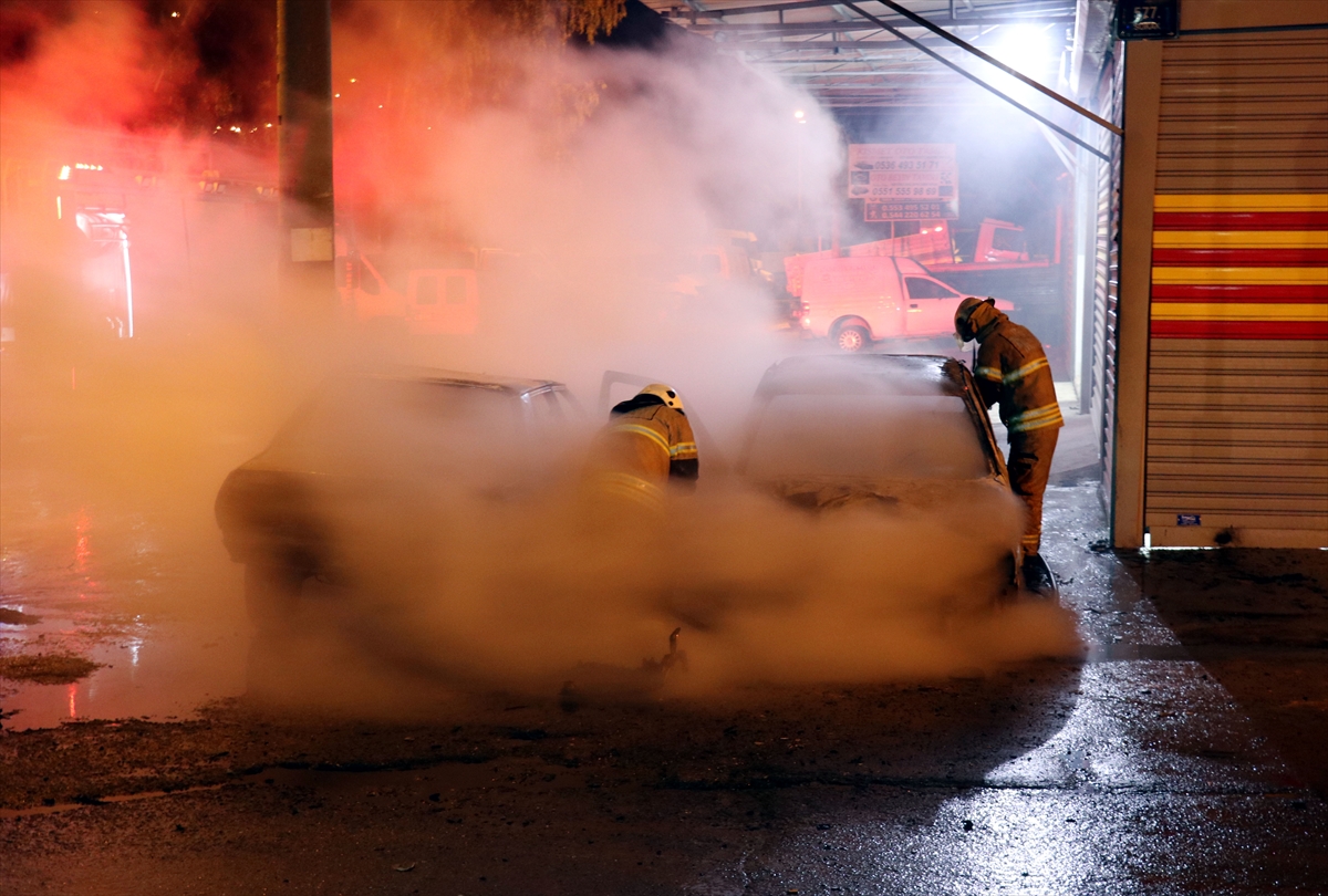 Yangında iki otomobil kullanılamaz hale geldi. Hasara yol açan yangının çıkış nedeni araştırılıyor.