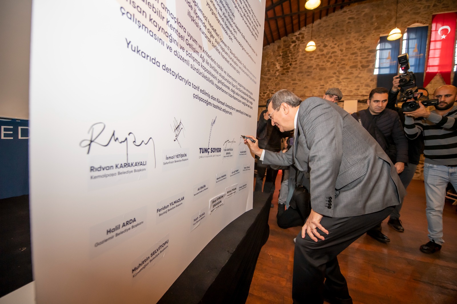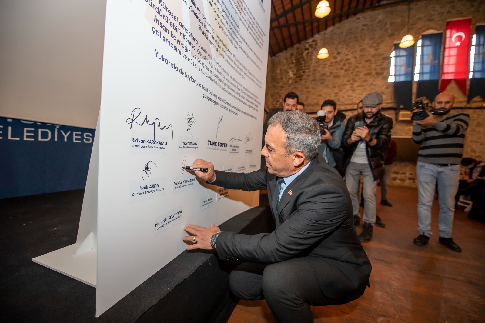 Protokole Başkan Soyer ile Kemalpaşa Belediye Başkanı Rıdvan Karakayalı, Seferihisar Belediye Başkanı İsmail Yetişkin, Selçuk Belediye Başkanı Filiz Ceritoğlu Sengel, Konak Belediye Başkanı Abdül Batur, Gaziemir Belediye Başkanı Halil Arda, Beydağ Belediye Başkanı Feridun Yılmazlar, Narlıdere Belediye Başkanı Ali Engin, Bayraklı Belediye Başkanı Serdar Sandal, Karşıyaka Belediye Başkanı Cemil Tugay, Menderes Belediye Başkanı Erkan Özkan, Karabağlar Belediye Başkanı Muhittin Selvitopu adına Belediye Başkan Yardımcısı Aykut Kolatar, Foça Belediye Başkanı Fatih Gürbüz, Karaburun Belediye Başkanı İlkay Girgin Erdoğan, Torbalı Belediye Başkanı Mithat Tekin, Balçova Belediye Başkanı Fatma Çalkaya, Buca Belediye Başkanı Erhan Kılıç imza attı.
