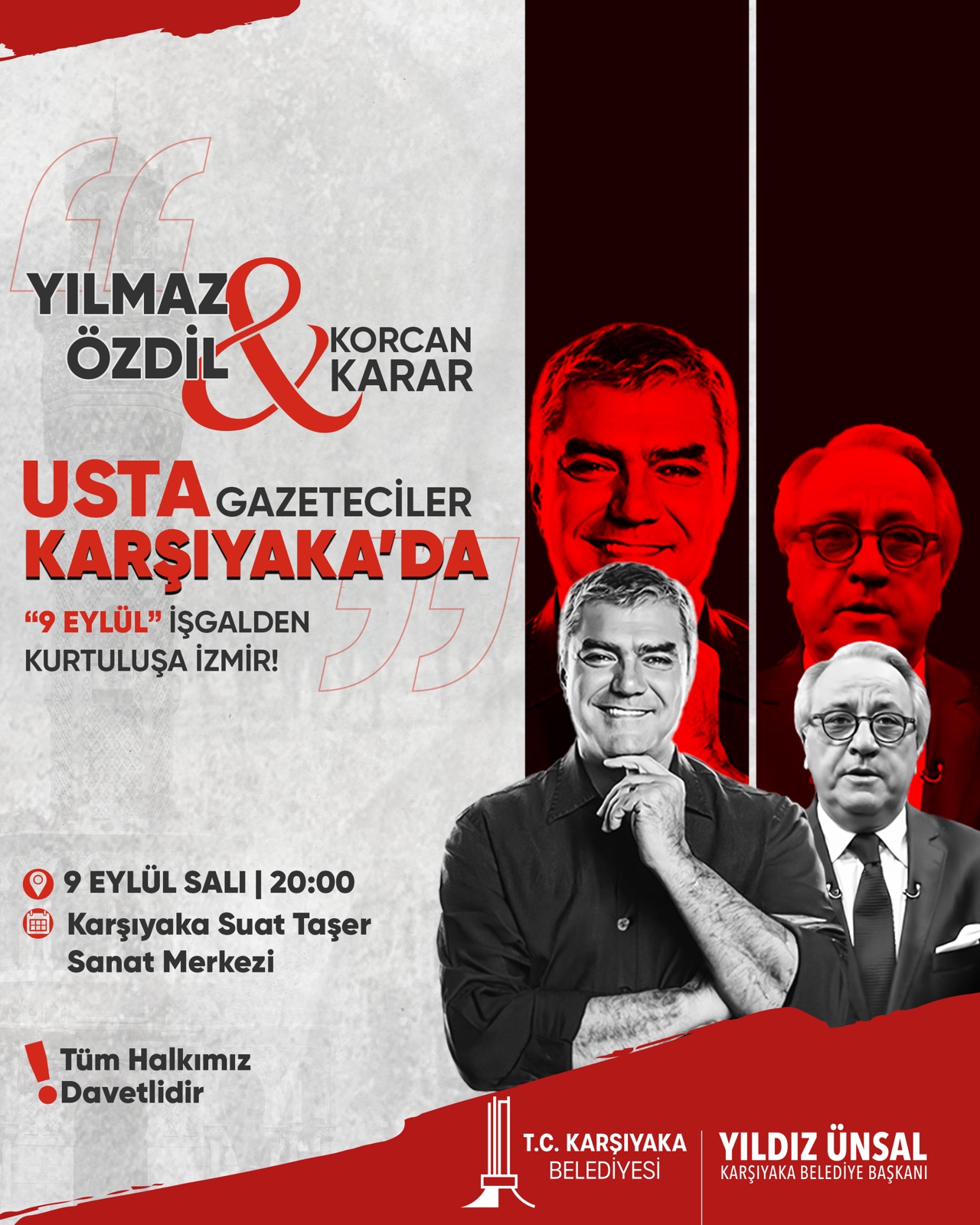 KORTEJ COŞKUSUKutlama programı, 9 Eylül Salı günü saat 18.00’de Karşıyaka Belediyesi önünden başlayacak kortejle start alacak. Karşıyaka Belediye Bandosu’nun eşlik edeceği kortej, bayraklar ve marşlar eşliğinde Çarşı içinden geçerek Hergele Meydanı’na ulaşacak. Karşıyakalılar, geçmişin kahramanlarına minnet ve saygılarını hep birlikte dile getirecek. 9 Eylül coşkusu, akşam saatlerinde gazetecilik dünyasının iki güçlü ismini Karşıyakalılarla buluşturacak. Saat 20.00’de Suat Taşer Sanat Merkezi’nde gerçekleştirilecek özel söyleşide gazeteci-yazar Yılmaz Özdil ve gazeteci Korcan Karar, İzmir’in kurtuluşu ve milli mücadeleye dair tarihi anekdotlar ve düşüncelerini paylaşacak. Bu özel buluşma, katılımcılara hem tarih dolu bir akşam hem de ilham veren bir sohbet sunacak.