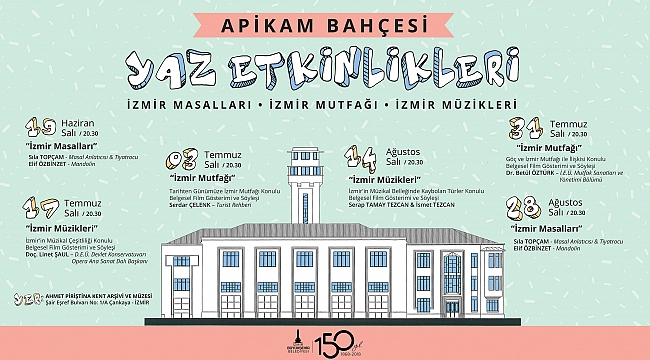 İzmir Büyükşehir Belediyesi 150. Yılında “İzmir Masalları”, “İzmir Mutfağı” ve “İzmir Müzikleri” tarihine ışık tutuyor. Yaz ayaları boyunca Ahmet Piriştina Kent Arşivi ve Müzesi (APİKAM) bahçesinde 15 günde bir Salı günleri saat 20.30’da gerçekleştirilecek.19 Haziran ve 28 Ağustos’ta masal Anlatıcısı ve Tiyatrocu Sıla Topçam, “İzmir Masalları”nı anlatacak. Topçam’a Elif Özbinet mandoliniyle eşlik edecek.3 Temmuz’da “İzmir Mutfağı” konulu söyleşide Turist Rehberi ve Ege Gastronomi Turizmi Derneği Başkanı Serdar Çelenk konuk olacak ve “Tarihten Günümüze İzmir Mutfağı” konulu kısa belgesel film gösterimi gerçekleşecek. 31 Temmuz günü “Göç ve İzmir Mutfağı’nın İlişkisi” kısa belgesel film gösterimi ardından, Ekonomi Üniversitesi Mutfak Sanatları ve Yönetimi Bölümü Öğretim Üyesi Dr. Betül Öztürk söyleşi konuğu olacak.“İzmir Müzikleri” konulu etkinliklerde, 17 Temmuz’da “İzmir'in Müzikal Çeşitliliği” konulu kısa belgesel film gösteriminin ardından D.E.Ü. Devlet Konservatuvarı Opera Ana Sanat Dalı Başkanı Doç. Linet Şaul söyleşi konuğu olacak.14 Ağustos’ta ise “İzmir'in Müzikal Belleğinde Kaybolan Türler” konulu kısa belgesel film gösteriminden sonra Serap Tamay Tezcan ve İsmet Tezcan söyleşi konuğu olacak.İzmir kültürü ve tarihini konu alan masaldan müziğe, belgeselden söyleşiye keyifle izlenecek “Apikam Bahçesi Yaz Etkinlikleri”ne katılım ücretsiz.