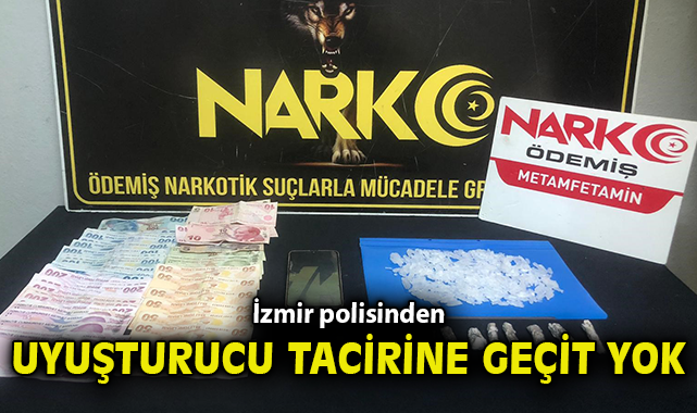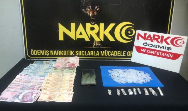 İzmir’in Ödemiş ilçesinde polis ekiplerinin takibi sonucu bir araca yapılan müdahale sonucunda E.A. isimli şüpheliden satışa hazır halde 7 paket metamfetamin, 1 adet telefon ve 5 bin 200 TL nakit para ele geçirildi. E.A.’nın evinde yapılan arama sonucunda ise toplamda yaklaşık 100 gram metamfetamin ele geçirildi.
