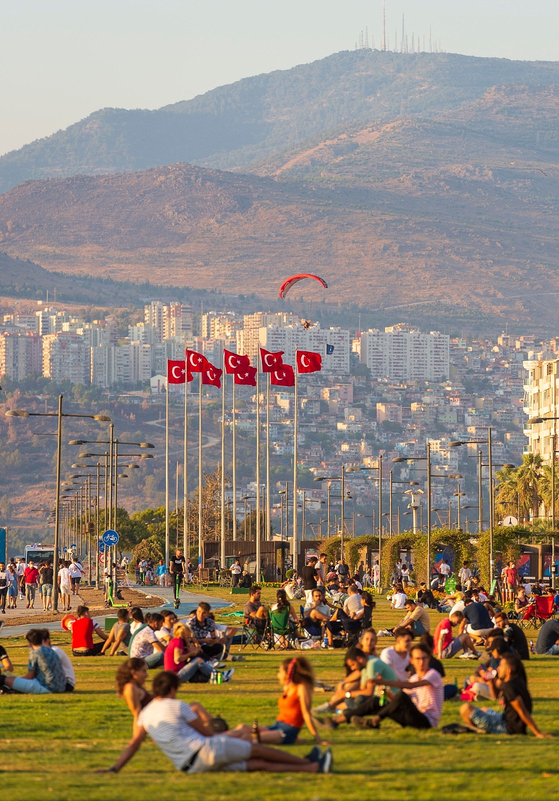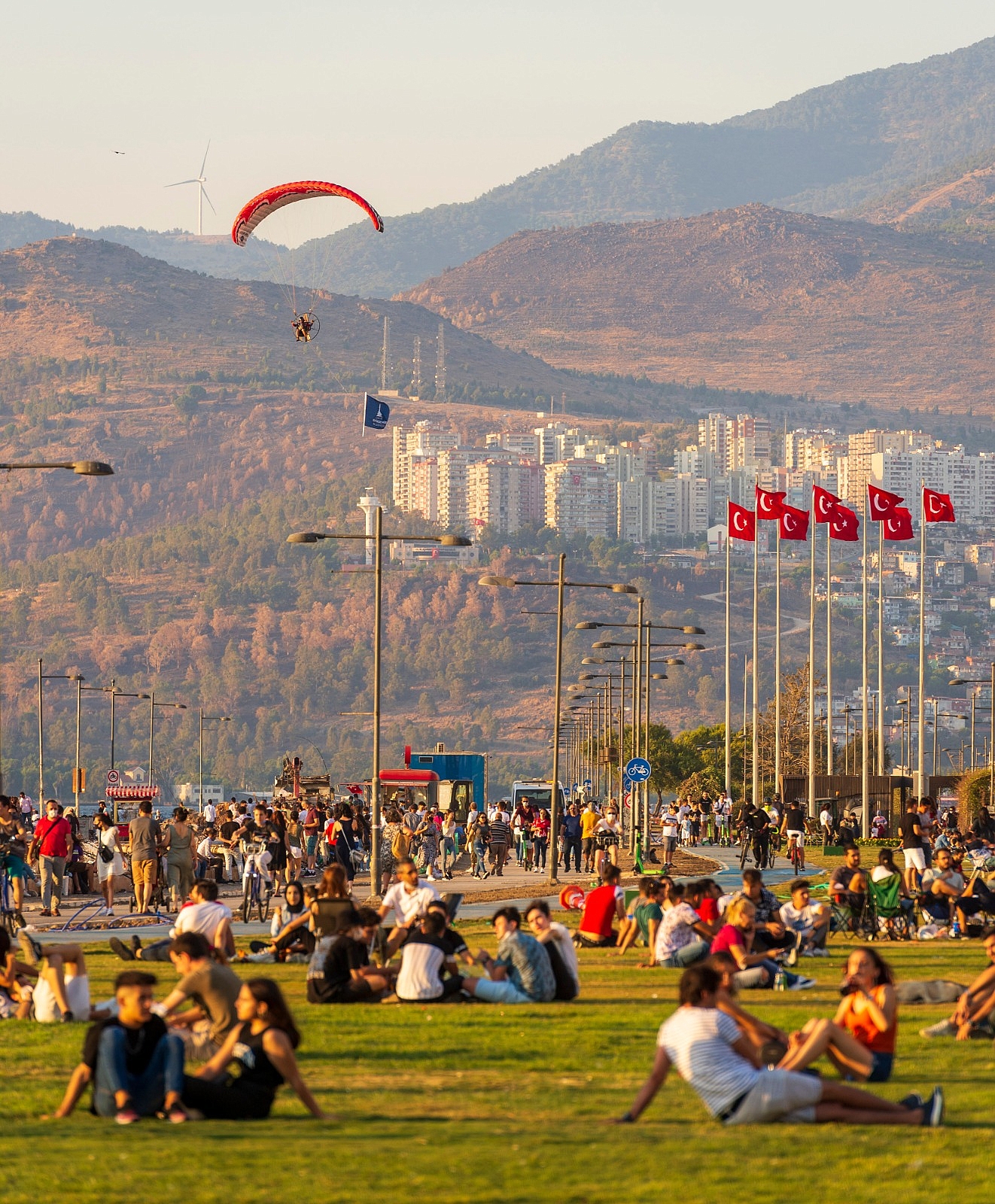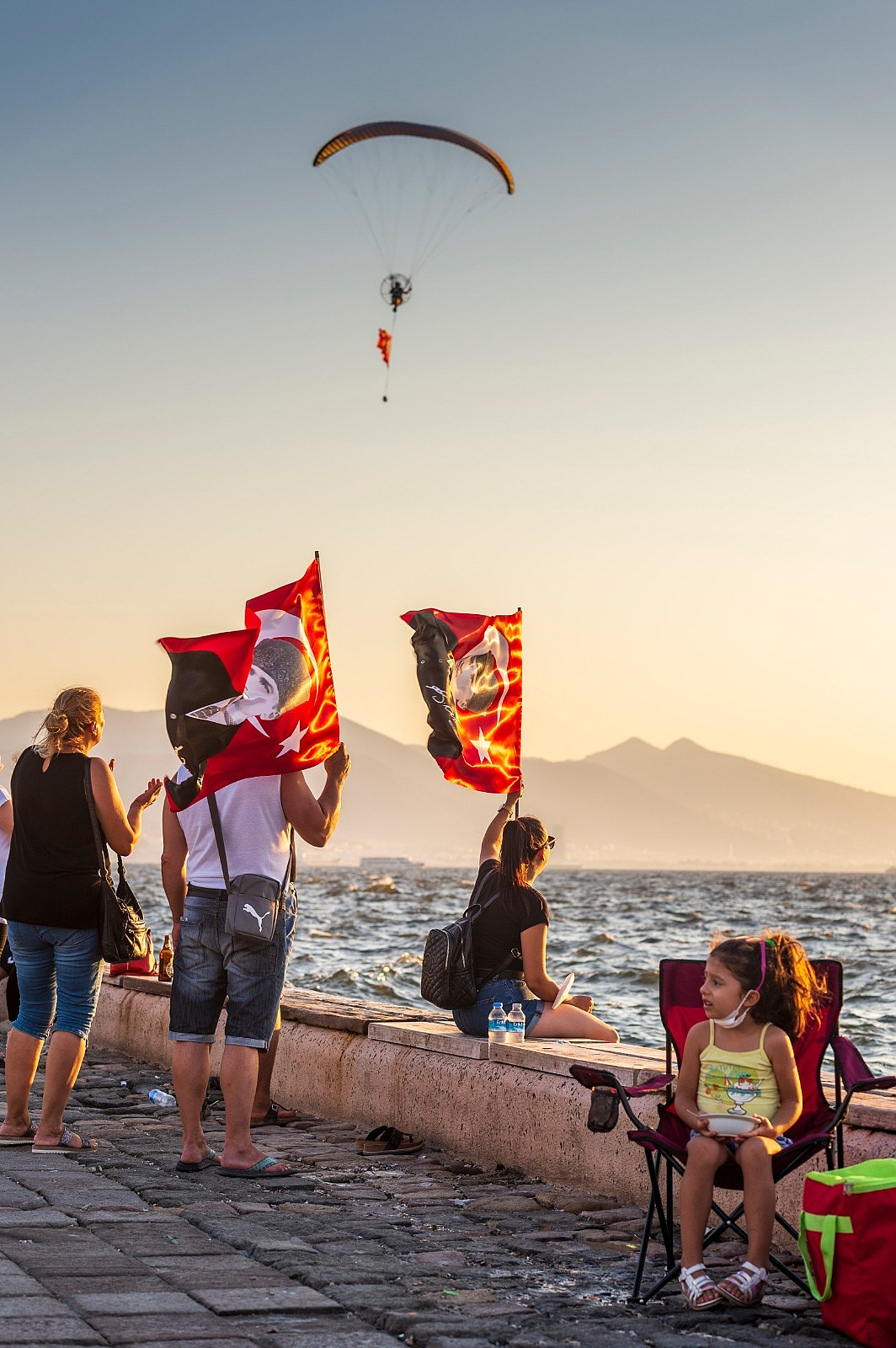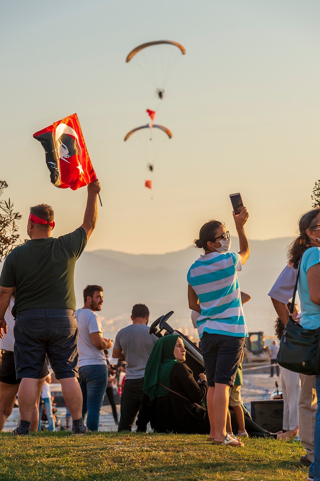 İzmir Büyükşehir Belediyesi 30 Ağustos Zafer Bayramı etkinliklerini gökyüzüne de taşıdı. Paramotorların Gündoğdu Meydanı üzerindeki hava gösterisi renkli görüntüler yarattı.