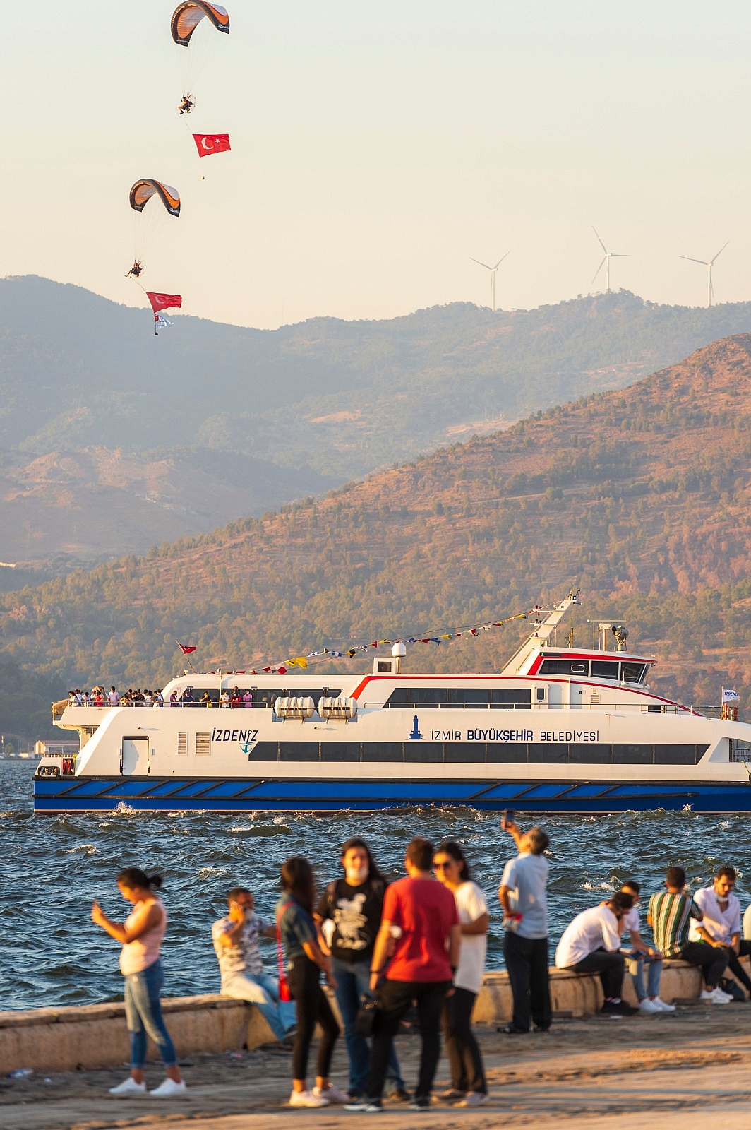 İzmir Büyükşehir Belediyesi 30 Ağustos Zafer Bayramı’nı paramotorların hava gösterisiyle taçlandırdı. Gündoğdu Meydanı’nda Türk bayrağı taşıyan paramotorlar izleyenlere keyifli ve coşkulu dakikalar yaşattı. İzmirliler Körfez kıyıları boyunca ilerleyen uçuş kortejini evlerinin balkonlarından izledi. Büyükşehir Belediyesi’nin 26 Ağustos’ta başlattığı Zafer Bayramı etkinlikleri 9 Eylül tarihine kadar sürecek.