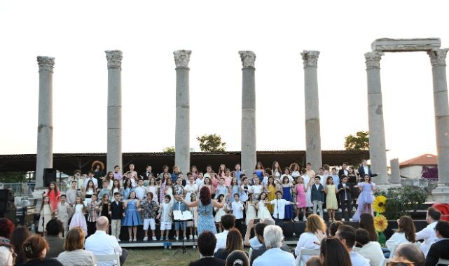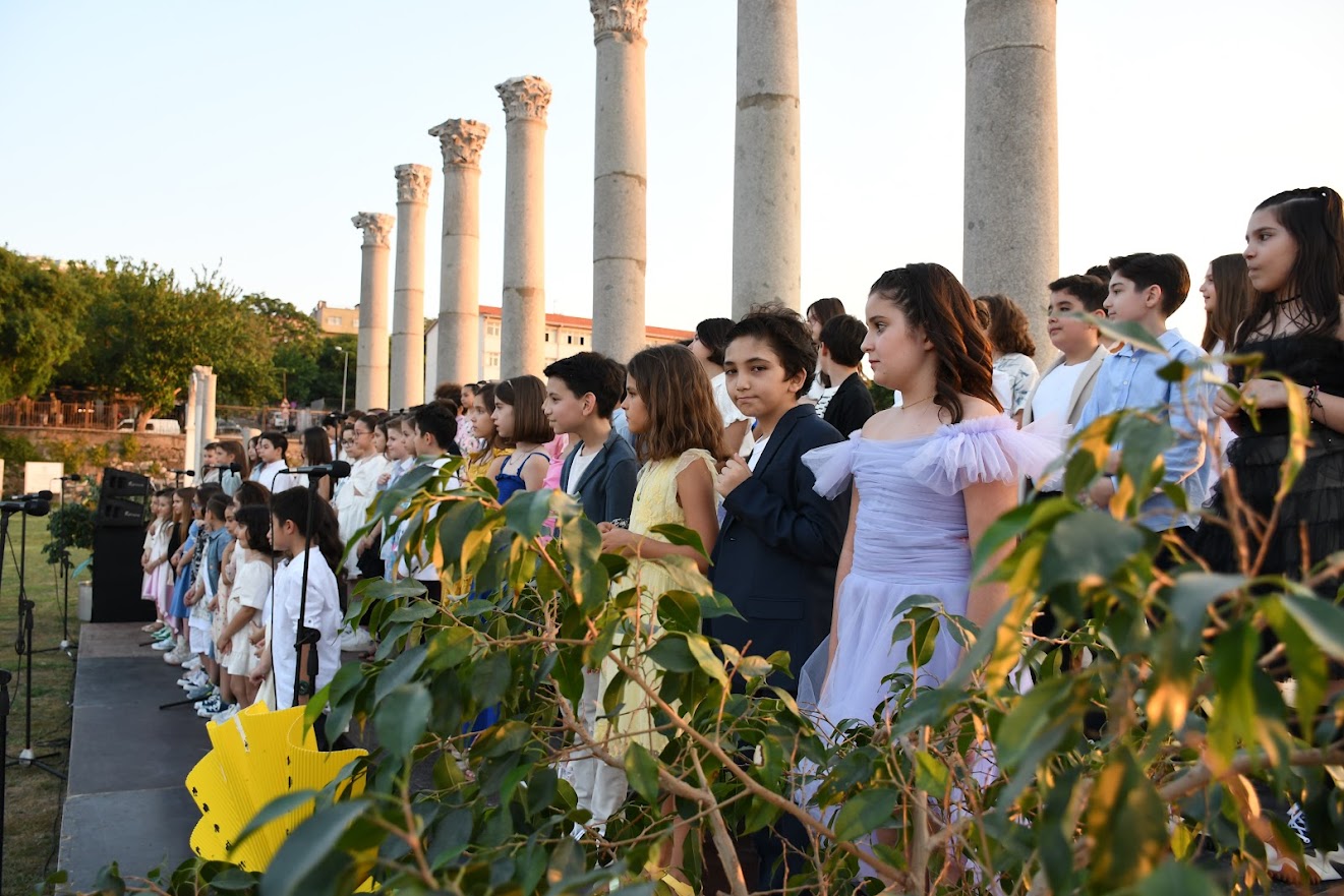 Konser öncesinde, İzmir Agora örenyerinin önemini ve tarihini öğrenen öğrenciler, büyük bir heyecanla sahne aldılar. Klasikleşmiş çocuk şarkılarından, türkülere, müzikallerden film müziklerine dolu dolu bir repertuvarla izleyicilerin karşısına çıkan İzmir SEV 4. Sınıf öğrencileri, farklı dillerde şarkı söyleyerek seyircileri dünya turuna çıkardılar. Özel İzmir SEV İlkokulu Müdürü Dr. Özlem Altay Yücesoy, öğrencilerine eğitim yuvaları olan olan SEV İlkokulu’nda değerli izler bırakarak bir üst kuruma geçtiklerini, Atatürk’ün Cumhuriyeti emanet ettiği çağdaş ve laik gençler olarak onlarla gurur duyduğunu ve öğrencilerine çok güvendiğini belirtti.