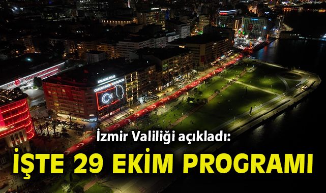 ÖNCÜŞEHİR - İzmir Valiliği, 29 Ekim Cumhuriyet Bayramı programını açıkladı. Cumhuriyet'in 100. yılında, Cumhuriyet Bayramı programı 28 Ekim'de çelenk sunumu ile başlayacak. Öğrencilerin harita görseli ve zeybek gösterisi ile devam edecek olan program, Atatürk Fotoğrafları Sergisi ve Bando konseri ile 28 Ekim Cumartesi günü programı sonlanacak.29 Ekim Pazar gününde ise tatbikat töreni, kutlama ve geçit töreni sonrasında, saat 20.00'de Fener Alayı ve havai fişek gösterisiyle program noktalanacak.Valiliğin açıkladığı program şu şekilde: