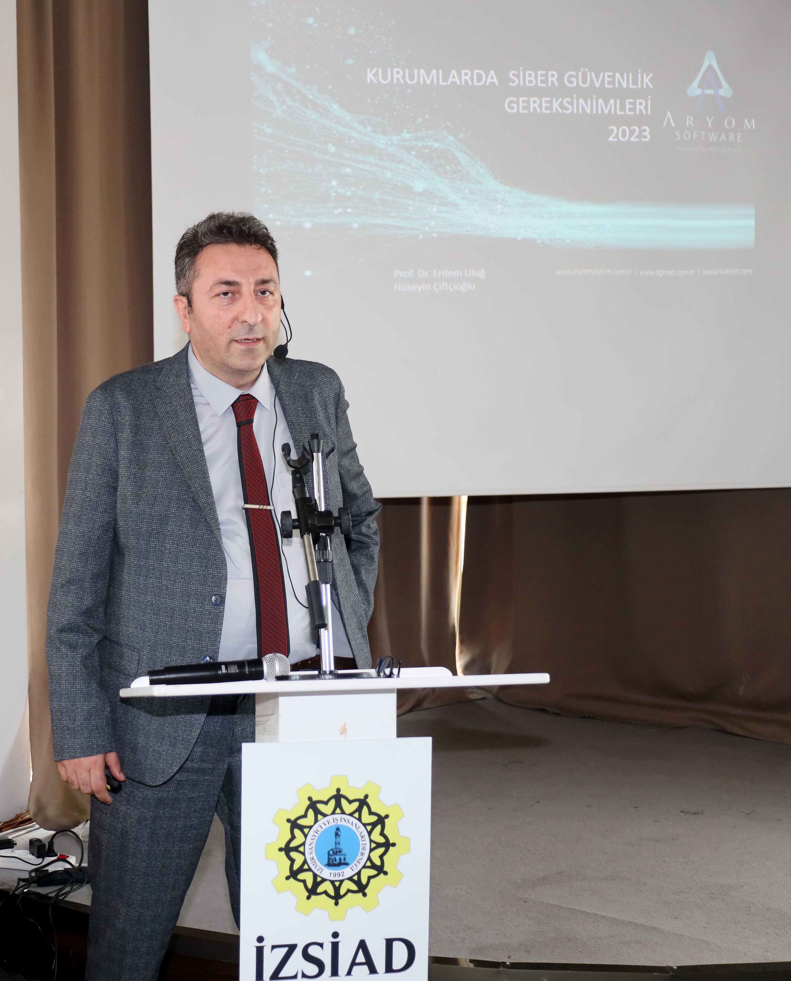 “Siber güvenlik önlemleri şart”Tepekule Kongre Merkezi’nde yapılan toplantının açılışında konuşan İZSİAD Yönetim Kurulu Başkanı Hasan Küçükkurt, özellikle pandemi ile beraber kurumlarda ve şirketlerde dijitalleşmenin çok büyük bir ivme kazandığını söyleyerek, buna bağlı olarak siber güvenlik problemlerinin de aynı oranda arttığını vurguladı. Kurumların dijitalleşme yolculuğunda ihmal etmemesi gereken siber güvenlik konusunda Emniyet Müdürlüğü Siber Suçlarla Mücadele Müdürlüğü’nden bir eğitim talebinde bulunduklarını ifade eden İZSİAD Başkanı Küçükkurt, “Bu kapsamda Adli Bilişim Büro Amiri Komiser Mustafa Yersiz’e katkılarından, sunumu gerçekleştiren Adli Bilişim Büro Memuru Onur Durukan’a sunumundan dolayı teşekkür ediyorum” dedi. ARYOM Yazalım katkılarıyla organize ettikleri bu seminerde konunun bilimsel yönüne de bakmak istediklerini söyleyen Küçükkurt, “ARYOM Yazılım Siber Güvenlik ve Yönetim Sistemleri Danışmanı Prof. Erdem Uluğ da bize almamız gereken önlemleri bilimsel veriler ışığında paylaştı. Kendisine ve katkılarından dolayı ARYOM Yazılım’a da teşekkür ediyorum” diye konuştu.