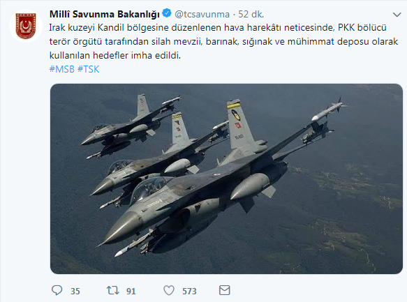 Bakanlığının Twitter hesabından, TSK'nin Irak'ın kuzeyine düzenlediği hava