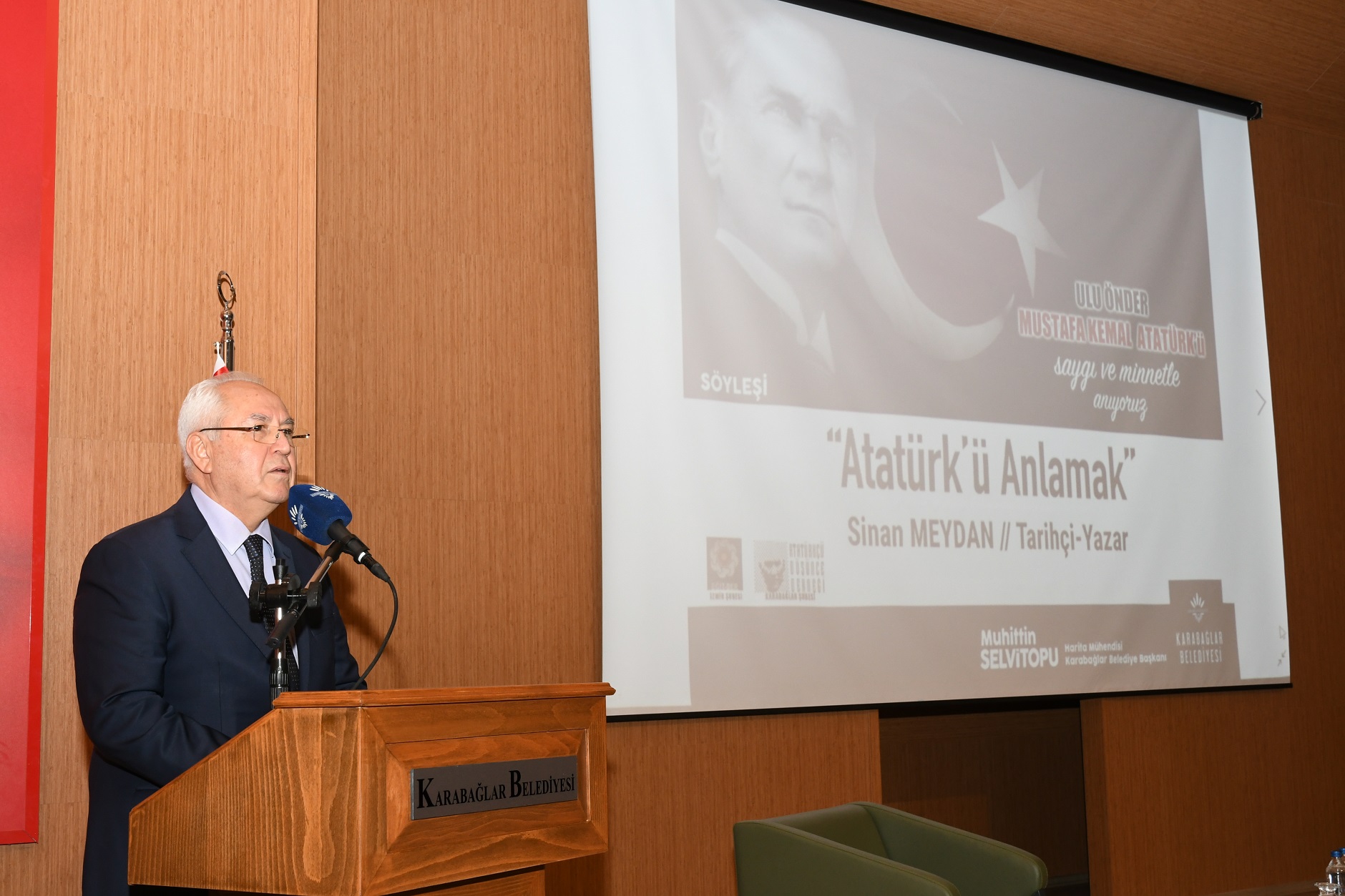 Karabağlar Belediyesi, Ulu Önder Mustafa Kemal Atatürk’ü aramızdan ayrılışının 84. yılında, Tarihçi Yazar Sinan Meydan’ın “Atatürk’ü Anlamak” başlıklı söyleşisiyle andı. Eğit-Der İzmir Şubesi ve Atatürkçü Düşünce Derneği Karabağlar Şubesi katkılarıyla düzenlenen etkinlik, Yıldız Kenter Kültür ve Sanat Merkezi (YKSM) Konferans Salonu'nda gerçekleştirildi. Vatandaşların yoğun ilgi gösterdiği ve salona sığmadıkları etkinlikte Meydan, Atatürk’ü tüm yönleriyle, 2 saati aşkın sürede anlattı. Meydan, Mustafa Kemal’in ulusuna ve vatanına olan bağlılığını vurgulayarak, “O, en zor koşullarda bile umudunu hiç kaybetmedi” dedi. Karabağlar Belediye Başkanı Muhittin Selvitopu da, Atatürk’ün düşüncelerinin Cumhuriyet var oldukça yaşayacağını vurguladı.Tarihçi Yazar Sinan Meydan’ın akıcı bir şekilde, görseller eşliğinde yaptığı sunumu, Başkan Selvitopu’nun yanı sıra, CHP’nin İzmir İl Başkan Yardımcısı Polat Manduz, İlçe Başkanı Mehmet Türkbay, İl Kadın Kolları Başkanı Nurdan Şenkal Uçar, Eğit-Der İzmir Şube Başkanı Nevzat Çakmak, ADD Şube Başkanı Mehmet Galip Gelebene, Karabağlar Kent Konseyi Başkanı Alev Ağrı, meclis üyeleri, muhtarlar, siyasi parti ve sivil toplum kuruluşlarının temsilcileriyle çok sayıda vatandaş izledi. Salona sığmayan vatandaşlar, girişe kurulan büyük ekranlardan söyleşiyi izleme olanağı buldu.