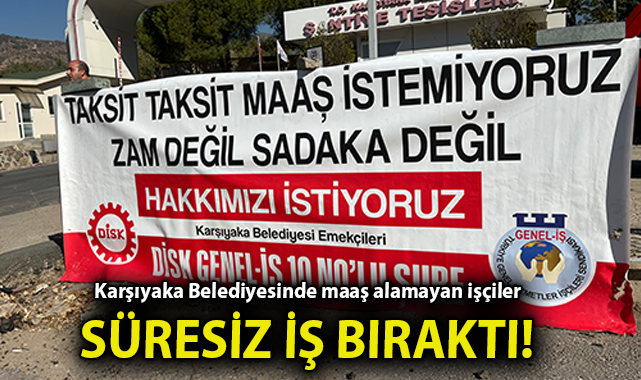 Karşıyaka Belediyesi'nde maaş krizinden dolayı dün gece başlayan iş bırakma eylemi, bugün de devam etti. İlçede başta çöp toplama olmak üzere birçok belediye hizmeti aksadı. Karşıyaka Belediyesi'nde örgütlü bulunan DİSK/Genel-İş 10 No'lu Şube, belediye yönetiminin aylardır maaşları ödememesi üzerine süresiz iş bırakma kararı aldıklarını duyurdu.