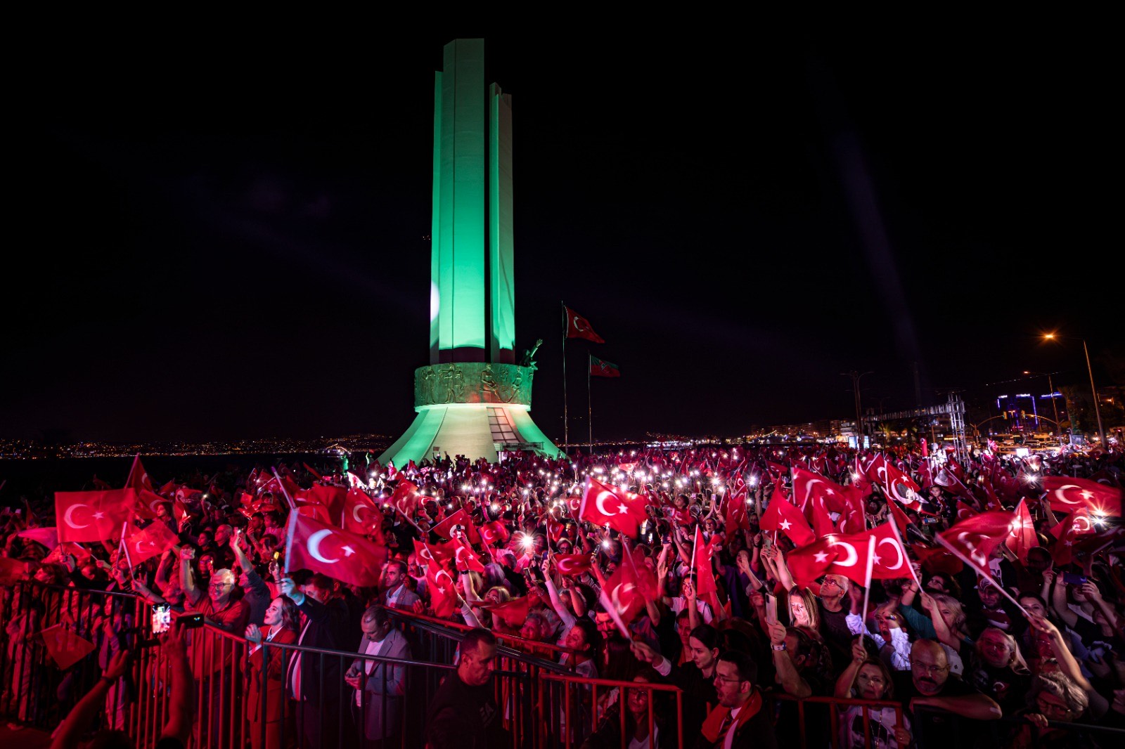Konuşması sık sık alkışlarla kesilen Başkan Dr. Cemil Tugay, “Cumhuriyet bize, biz Cumhuriyete çok yakışıyoruz. Doğum günün kutlu olsun Türkiye Cumhuriyeti! Sana Cumhuriyet’in Karşıyaka’sından nice 100 yıllar diliyorum!” dedi. ELLERDE BAYRAKLAR, DİLLERDE MARŞLAR Cumhuriyet’in 100. yılı dolayısıyla günlerdir birbirinden coşkulu etkinliklerle imza atan Karşıyaka Belediyesi, kutlama programını muhteşem bir geceyle taçlandırdı. Fener alayı için Karşıyaka Belediyesi önünde bir araya gelen coşkulu kalabalık, Çarşı içinden geçerek Atatürk, Annesi ve Kadın Hakları Anıtı’na yürüdü. Karşıyaka Belediye Bandosu’nun da eşlik ettiği binlerce yurttaş; ellerinde Türk Bayrakları, dillerinde marşlarla Cumhuriyet’e sonuna kadar sahip çıkacaklarını haykırdı. Paramotor sürücüsü bir vatandaşın korteji gökyüzünden selamlaması da renkli görüntüler oluşturdu. TÜRKİYE HARİTASI OLUŞTURDULAR Atatürk, Annesi ve Kadın Hakları Anıtı önüne ulaşan kalabalığı, Karşıyaka Belediyesi Halk Dansları Topluluğu karşıladı. Önce vals gösterisi sunan topluluk, ardından 100. yıl için hazırladıkları koreografiyle Türkiye haritası oluşturdu. Sanatçı Yüksel Ünal’ın duygusal sunumuyla gerçekleşen etkinlikte dansçılar Türkiye’nin dört bir yanına ait dans gösterilerini sergiledi. Büyük bir coşkuyla halaylar çekildi, horon ve kafkas oyunları oynandı. Gösterinin finalindeki zeybek oyunu ise geceye damga vurdu. Yurttaşlar da gösteri boyunca dansçılara eşlik etti. ŞARKILAR CUMHURİYET İÇİN SÖYLENDİ Programın devamında gerçekleşen Aegean Band konseri ise gecenin coşkusunu daha da büyüttü. En güzel şarkılarını Cumhuriyet’in 100. yaşı için söyleyen orkestra, alanı dolduran yurttaşlara unutulmaz bir müzik ziyafeti yaşattı. Cumhuriyet’in 100. yılına yakışan coşku ve heyecan dolu anların yaşandığı akşamda; başta Türkiye Cumhuriyeti’nin kurucusu Ulu Önder Gazi Mustafa Kemal Atatürk olmak üzere milli mücadeleye adını altın harflerle yazdıran kahramanlar saygı ve minnetle anıldı.