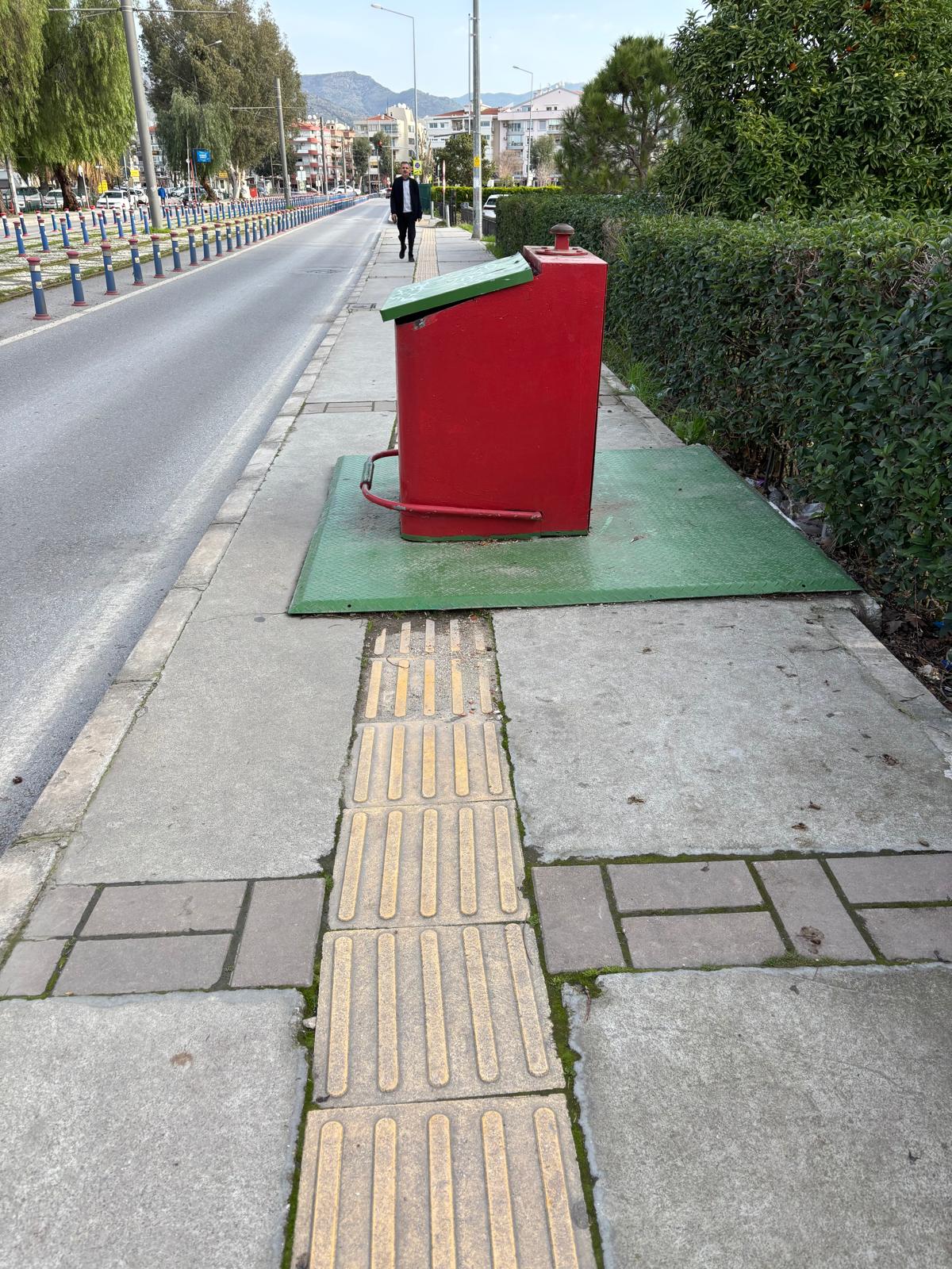 Aynı cadde üzerindeki bir başka noktada ise bu kez çöp konteynerinin doğrudan engelli yürüyüş yolunun üzerine yerleştirilmesi dikkat çekti. Görme engelliler için yapılan sarı kılavuz taşların tam üzerine konulan konteyner, engelli bireylerin yolu güvenli şekilde kullanmasını neredeyse imkansız hale getirdiği görüldü.HABER MERKEZİ