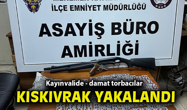 Menemen İlçe Emniyet Müdürlüğüne bağlı Asayiş Büro Amirliği ekipleri, ilçede uyuşturucu madde sattığı belirlenen A.A.'yı takibe aldı. Yapılan çalışmalarda şüphelinin, kayınvalidesi E.D. İle birlikte uyuşturucu madde ticareti yaptığı belirlenirken, polis ekipleri adresleri belirleyerek operasyon için düğmeye bastı. Adreslerde yapılan aramalarda, kayınvalide E.D.'nin ikametinde mavi bir çanta içerisinde çok sayıda yeşil reçeteye tabi sentetik ecza maddesi ve gazete kağıdına sarılı exctacy hap ile bir ruhsatsız tabanca ele geçirildi. Damat A.A.'nın ikametinde ise, bir ruhsatsız pompalı tüfek ele geçirilirken 2 şüpheli de gözaltına alınarak emniyete götürüldü. Emniyetteki işlemlerinin ardından adliyeye sevk edilen kayınvalide ve damat tutuklandı.