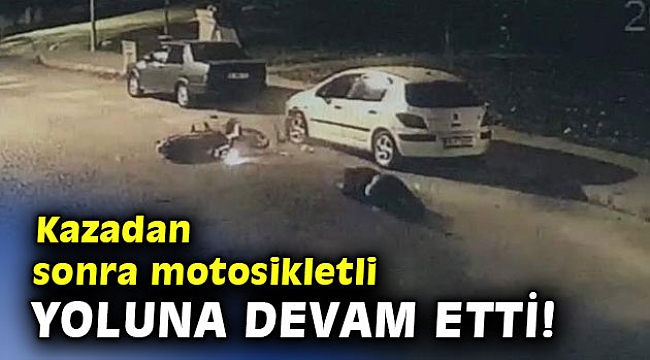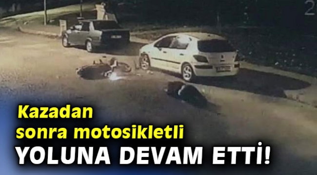 İzmir'in Bergama ilçesinde park halindeki otomobile çarparak yola savrulan motosikletin sürücüsü, yara almadan kurtulduğu kazanın ardından motosikletine binerek uzaklaştı.