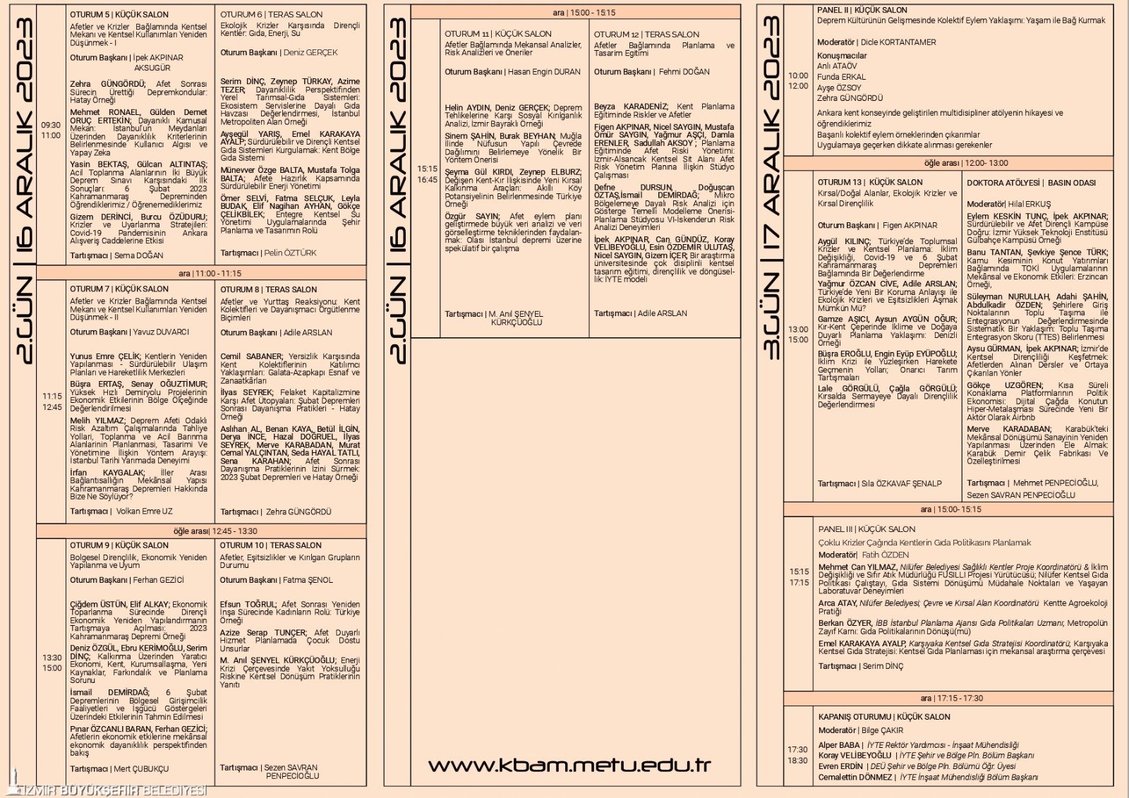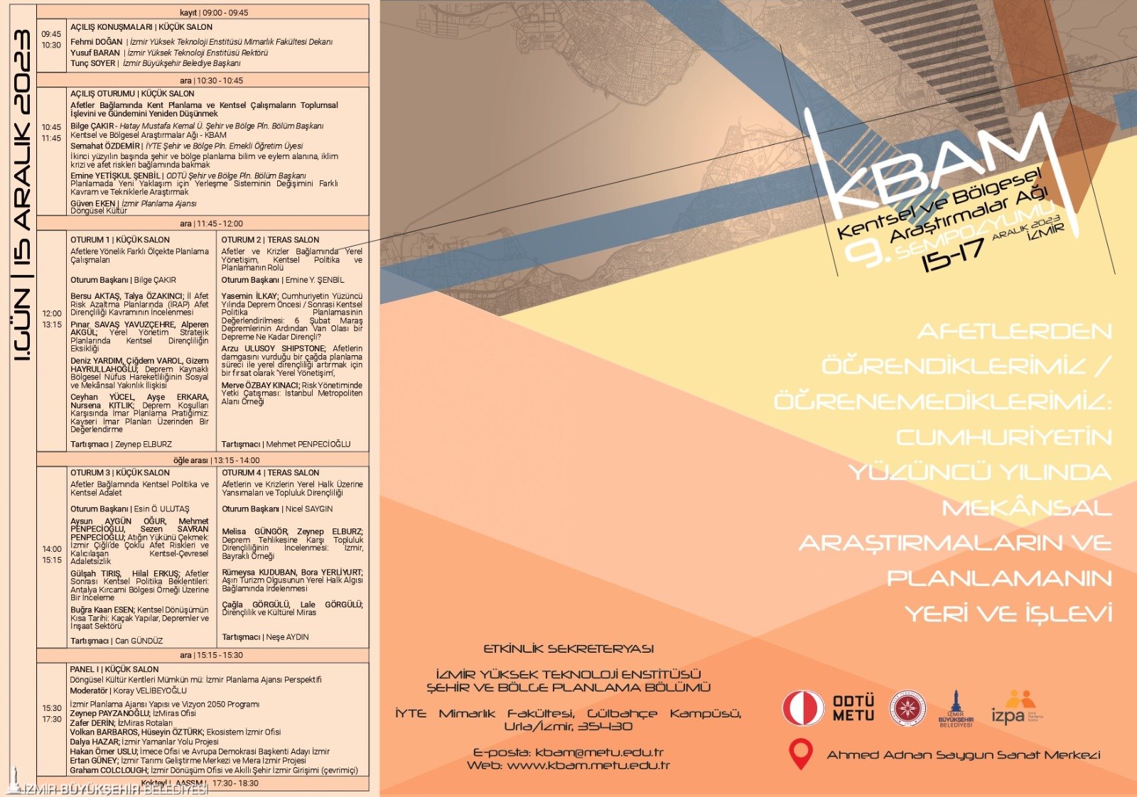 Kentsel ve Bölgesel Araştırmalar Ağı’nın (KBAM) 9’uncu sempozyumu bu yıl 15-17 Aralık tarihlerinde, “Afetlerden Öğrendiklerimiz/Öğrenemediklerimiz: Cumhuriyetin Yüzüncü Yılında Mekânsal Araştırmaların ve Planlamanın Yeri ve İşlevi” temasıyla yapılacak. İsteyen herkesin ücretsiz katılabileceği sempozyum, İzmir Büyükşehir Belediyesi’nin desteği ve İzmir Yüksek Teknoloji Enstitüsü (İYTE) ev sahipliğinde, Ahmed Adnan Saygun Sanat Merkezi’nde düzenlenecek.