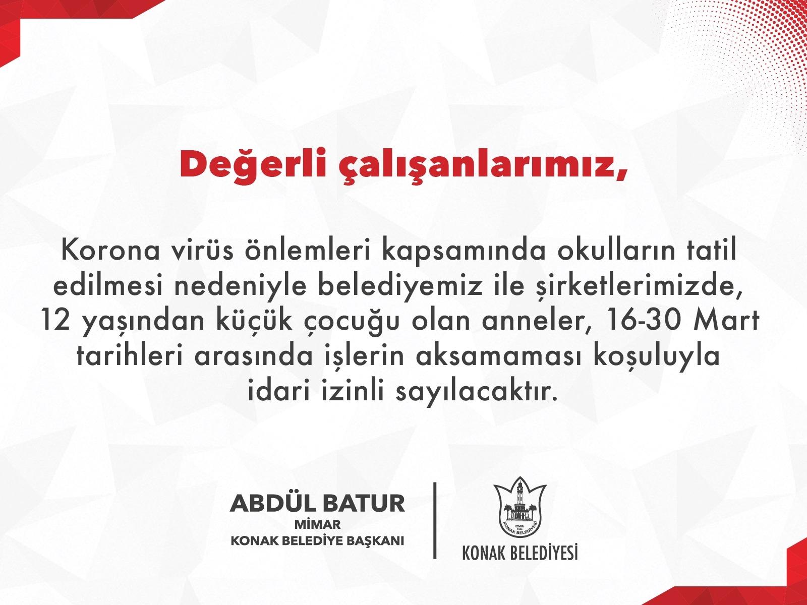 Tüm dünyayı etkisine alan ve ülkemizde de ilk vakaların görüldüğü Koronavirüs salgınına karşı Konak Belediyesi’nin aldığı önlemlere, okulların tatil edilmesiyle birlikte bir yenisi daha eklendi. Okulların tatil edilmesinin ardından Konak Belediyesi, belediye ve belediyeye ait şirketlerin çalışanlarının zor durumda kalmaması için Konak Belediye Başkanı Abdül Batur’un talimatıyla bir genelge yayımlandı. Buna göre 16 Mart ile 30 Mart tarihleri arasında, 12 yaşın altında çocuğu olan anneler idari izinli sayılacak.