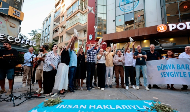 Konuşmaların ardından ortak basın açıklamasını okuyan Ege Kent Konseyleri Birliği Başkanı ve Konak Kent Konseyi Başkanı Hamit Mumcu, “Bugün insanlığın en büyük özlemi olan barış kelimesini haykırmak için toplandık. 1 Eylül Dünya Barış Günü, faşizmin karanlık gölgesinde başlayan 2.Dünya Savaşı’nın yıl dönümüdür. Milyonların ölümüne, şehirlerin yıkımına, toplumların parçalanmasına yol açan o büyük felaketin ardından insanlık, ‘bir daha asla’ dedi. Bugün, o sözü yeniden hatırlatmak, yeniden savunmak için burada ve bir aradayız. Ama biliyoruz ki savaş sadece cephede değil; yoksullukla, sömürüyle, doğanın talanı ile kadınlara yönelik baskıyla, mültecilerin kapılarına vurulan zincirlerle de sürüyor. Bizim için barış, yalnızca savaşsızlık değil; sömürüsüz, eşit, özgür ve ekolojik bir yaşamın kurulmasıdır. Bu yüzden barış mücadelesi aynı zamanda emek mücadelesidir, çevre mücadelesidir, özgürlük mücadelesidir” vurgusu yaptı.