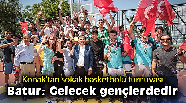 Konak Belediyesi’nin 19 Mayıs Atatürk’ü Anma, Gençlik ve Spor Bayramı kutlamaları kapsamında düzenlediği Sokak Basketbolu Turnuvası’nda şampiyon takımlar kupalarını aldı. Ödül töreninde konuşan Başkan Batur, Ulu Önder Mustafa Kemal Atatürk’ün “Bütün ümidim gençliktedir” sözlerini hatırlatarak, “Biz gençlerimize güveniyoruz, gelecek gençlerdedir, diyoruz. Bu anlayışla çalışmalarımızı yürütüyoruz. Sizlere güveniyoruz ve sizi çok seviyoruz” dedi.