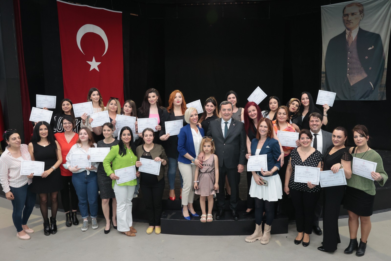 Konak Belediyesi’nin Güzelyalı Nazım Hikmet Kültür Merkezi’nde bu yıl ilk kez düzenlediği Güzellik Uzmanlığı ve Estetisyenlik Kursunun mezunları sertifikalarını aldı. Usta Öğretici Pınar Özdemir’le birlikte kasım ayından bu yana cilt bakımı ve temel makyaj, kalıcı makyaj ve protez tırnak gibi alanlarda eğitimlerini tamamlayan kursiyerlerin mezuniyet ve sertifika töreni Konak Belediye Başkanı Abdül Batur’un katılımıyla gerçekleşti. Mezun olan kursiyerlere iş yeri açabilmeleri, Güzellik Uzmanlığı ve Estetisyenlik alanında mesleklerini icra edebilmelerinde anahtar olacak sertifikalarını veren Başkan Batur, eğitmen Pınar Özdemir’e de emeklerinden ötürü teşekkür plaketi verdi.