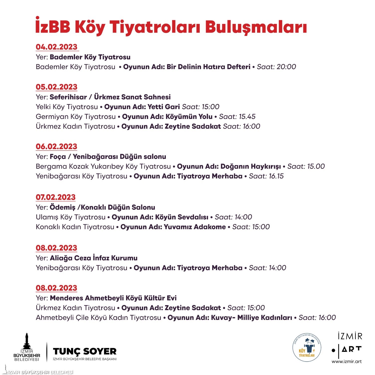 İzmir Büyükşehir Belediye Başkanı Tunç Soyer’in kültür sanat vizyonu doğrultusunda kırsalda sanat üretimini başlatmak ve köylülerin kişisel gelişimine katkı sağlamak için kurulan İzmir Büyükşehir Belediyesi Köy Tiyatroları, yeniden izleyiciyle buluşuyor. İzmir’in köylerinden çıkarak sanata yönelen tiyatro emekçilerini bir araya getirecek İzmir Büyükşehir Belediyesi Köy Tiyatroları Buluşmaları, 4-8 Şubat tarihlerinde “Biz Bize” adıyla düzenlenecek. Buluşmaların ilki 4 Şubat Cumartesi günü 20.00’de Urla Bademler Köy Tiyatrosu’nda “Bir Delinin Hatıra Defteri” oyunuyla yapılacak.Köy Tiyatroları Buluşmaları "Sanata dokunan ellerde kir barınmaz" sloganıyla dört gün boyunca Urla, Seferihisar, Foça, Aliağa, Ödemiş ve Menderes’te yapılacak. Her köy kendi hikâyesinden yola çıkarak köy seyirlik tarzı oyunları seyirciyle buluşturacak.