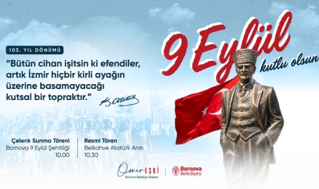 Bornova Belediyesi, İzmir’in kurtuluşunun 103. yıl dönümünü 8–9 Eylül’de düzenleyeceği törenler ve etkinliklerle kutlayacak. Programda Atatürk Evi ziyareti, Belkahve Ata Anı Evi’nde törenler, konserler ve 9 Eylül Şehitliği ile Belkahve Atatürk Anıtı’nda anma ve kutlama etkinlikleri yer alacak. Başkan Ömer Eşki, 9 Eylül’ün özgürlüğün ve bağımsızlığın simgesi olduğunu vurguladı, tüm Bornovalıları etkinliklere katılmaya davet etti.