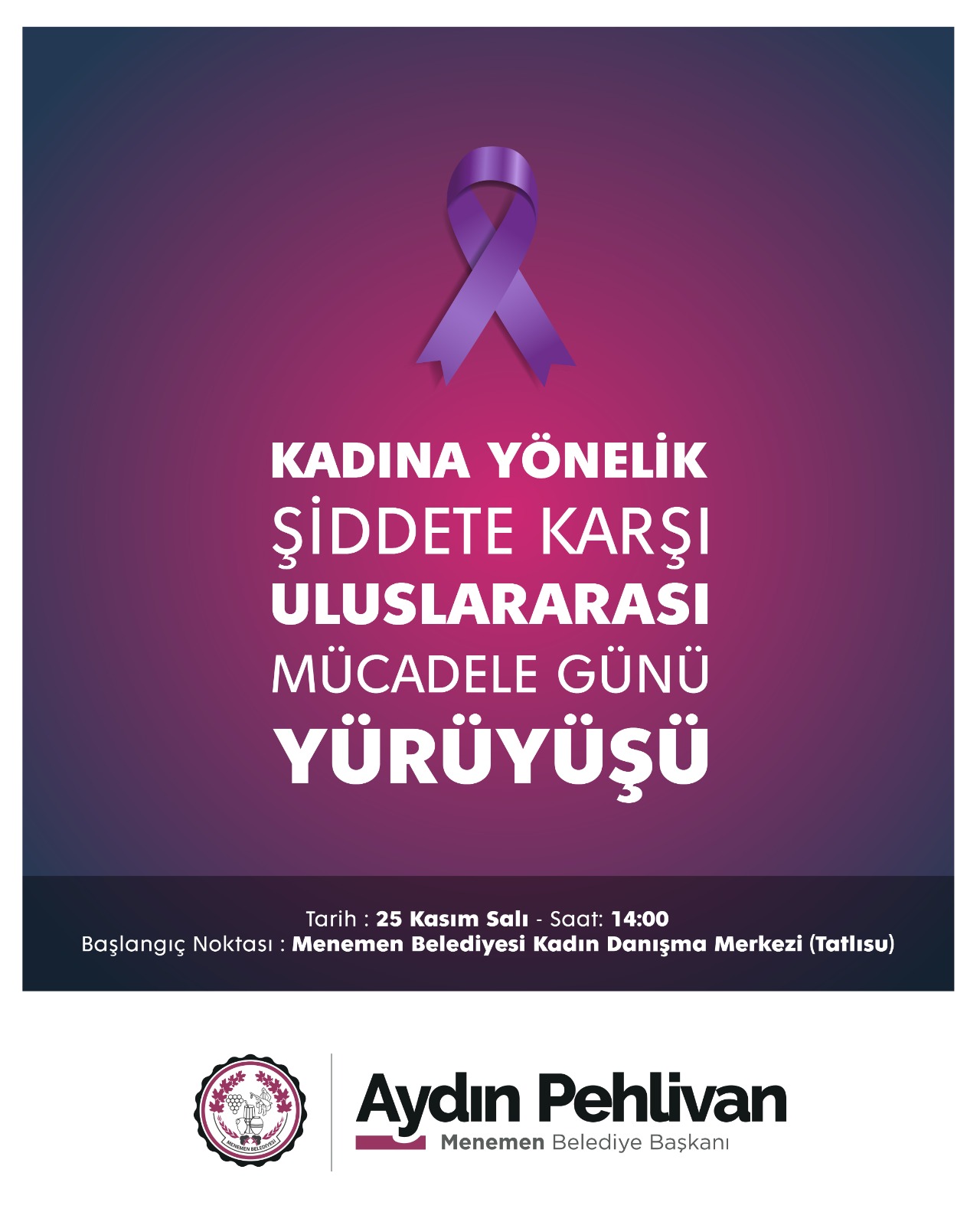 Menemen Belediyesi, toplumun en önemli gündem maddelerinden olan kadına şiddet konusunda, 25 Kasım Kadına Yönelik Şiddete Karşı Uluslararası Mücadele Günü kapsamında önemli etkinliklere imza atacak. Program, 25 Kasım günü saat 14.00'te Menemen Belediyesi Kadın Danışma Merkezi önünden farkındalık yürüyüşü ile başlayacak. Kadına şiddete karşı pankartlar, dövizler ve sloganlarla gerçekleştirilecek olan yürüyüş, Menemen Belediyesi önünde son bulacak.
