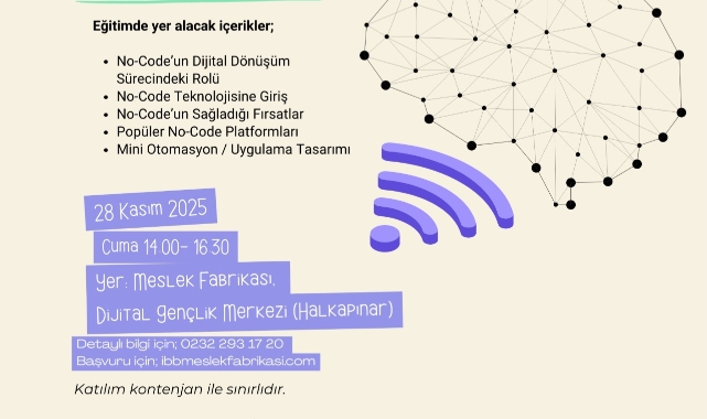 İzmir Büyükşehir Belediyesi’nin istihdam odaklı eğitim politikalarının en önemli ayağı olan Meslek Fabrikası,kod yazmadan mobil uygulamalar veya arayüzler geliştirilmesini sağlayan No-Code teknolojisi eğitimi verecek. Uygulama oluşturma fikri olan, ancak kodlama hakkında bilgisi olmayanların basit ve ucuz bir şekilde aklındaki uygulamayı geliştirmesini sağlayan teknolojiyi öğrenen kursiyerler; eğitim sonunda "No-Code’un Dijital Dönüşüm Sürecindeki Rolü, No-Code Teknolojisine Giriş, No-Code’un Sağladığı Fırsatlar, Popüler No-Code Platformları ve Mini Otomasyon / Uygulama Tasarımı” konularında bilgi sahibi olacak.Başvuru yapılabiliyorHalkapınar'da yer alan Meslek Fabrikası Dijital Gençlik Merkezi'nde gerçekleştirilecekprogramda eğitimi Endüstri Mühendisi Simge Erkin verecek. 28 Kasım Cuma günü, 14.00-16.30 saatleri arasında düzenlenecek programa 16-30 yaş aralığındaki gençler başvurabiliyor. Başvuru için https://www. ibbmeslekfabrikasi.com/tr/ Kayitol/57?merkezId=117& kursId=2276 adresi ziyaret edilebilir. Detaylı bilgi için 293 17 20 numaralı telefon aranabilir.