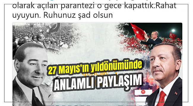 27 Mayıs 1960’ta yapılan darbenin ardından dönemin Başbakan’ı Adnan Menderes ile Dışişleri Bakanı Fatin Rüştü Zorlu ve Maliye Bakanı Hasan Polatkan, darbecilerin kurduğu mahkemelerce idama mahkum edildi ve bu hüküm infaz edilerek, Türkiye’nin demokrasi tarihine kara bir leke düşüldü. Ancak 27 Mayıs’taki darbe ile açılan bu parantezin içine daha sonraki yıllarda başka darbeler de sığdırıldı. Türkiye’nin demokrasi mücadelesine yeni lekeler sürüldü.27 Mayıs darbesinin yıl dönümünde sosyal medya hesaplarından bu darbelere gönderme yapan bir mesaj paylaşan Ak Parti İzmir İl Gençlik Kolları Başkanı Eyüp Kadir İnan, Türk milletinin 15 Temmuz’daki şanlı direnişi ile 27 Mayıs’ta açılan bu parantezin kapatıldığını yazdı. O PARANTEZİ 15 TEMMUZ’DA KAPATTIKİl Gençlik Kolları Başkanı İnan, “Başvekilim! 27 Mayıs 1960'ta bir parantez açılmıştı. Onca yıl sürdü. 15 Temmuz Gecesi yine aynı senaryoyu uygulamak istediler. Fakat biz emanetinizi unutmadık. Liderimiz @RT_Erdogan 'ın dik duruşuyla, gençler olarak açılan parantezi o gece kapattık. Rahat uyuyun. Ruhunuz şad olsun” diye yazdı. YÜZLERCE YORUM GELDİAK Parti İzmir İl Gençlik Kolları Başkanı Eyüp Kadir İnan’ın bu paylaşımı sosyal medyada büyük ilgi gördü. Yüzlerce kişi Eyüp Kadir İnan’ın bu mesajına destek veren yorumlarla karşılık verdi.