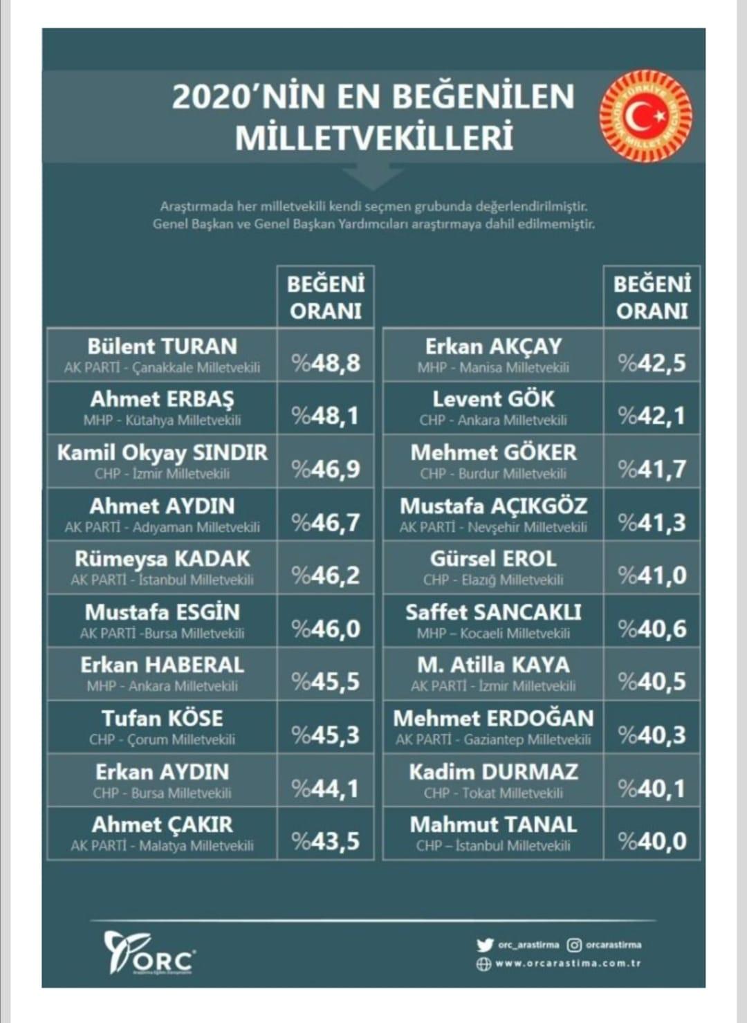 2020 yılına ilişkin farklı alanlarda yapılan araştırmalara bir yenisi daha eklendi. Ülke çapında yaptığı araştırmalarla dikkat çeken İstanbul merkezli ORC Araştırma Şirketi, 2020’nin en beğenilen milletvekillerine dair bir çalışma yaptı. Araştırmada her milletvekilinin kendi seçmen grubunda değerlendirildiği, genel başkan ve genel başkan yardımcılarının araştırmaya dahil edilmediği belirtildi. İzmir’den ise iki vekil ilk 20’ye girdi.