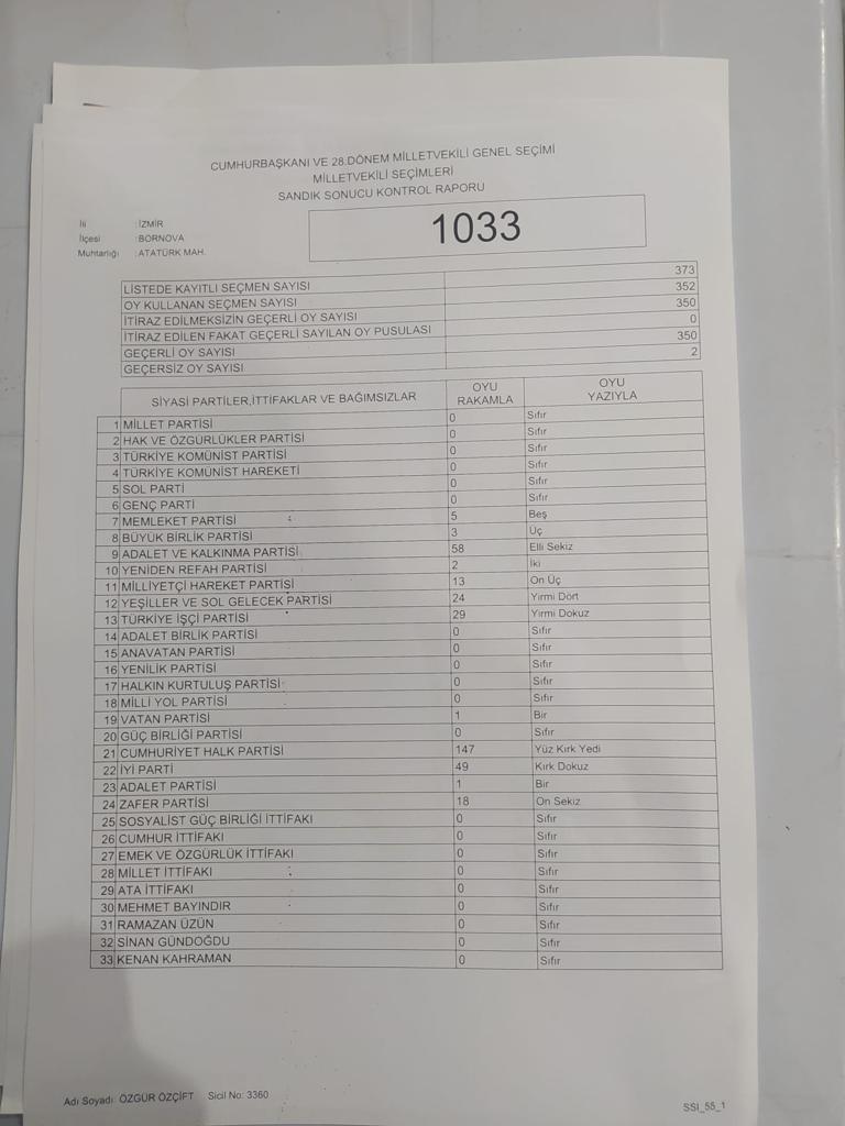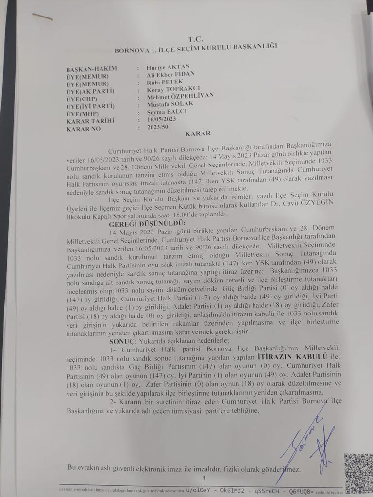 Bu vesile ile sosyal medyada gündeme getirilen ve konuşulan iki sandığa ilişkin bilgiyi örnek olması bakımından vermek isterim. Bornova 1033 No’lu sandıkta CHP’nin oyu 147 iken 49 yazılmıştı. Yaptığımız itiraz üzerine bu hata düzeltildi. Yine Bornova 1341 No’lu sadıkta CHP’nin oyu 68 iken 1 yazılmıştı. Bu hata da yaptığımız itiraz üzerine düzeltildi. Buna benzer birçok hata düzeltildi ve oy sayılarının sisteme doğru şekilde girilmesi sağlandı.