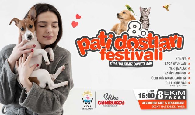 Çiğli Belediyesi Veteriner İşleri Müdürlüğü'nün organize edeceği 8. Pati Dostları Festivali, 8 Ekim Pazar günü saat 16:00'da Akvaryum Kafe Restoran'da gerçekleştirilecek. Festivalde konser, çocuk tiyatrosu gösterimi, yarışmalar ve spor oyunlarının yanı sıra sahiplendirme ve mama dağıtımı yapılacak.