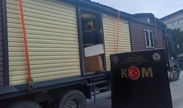 Manisa İl Emniyet Müdürlüğü Kaçakçılık ve Organize Suçlarla Mücadele Şube Müdürlüğü ekipleri tarafından gerçekleştirilen çalışmada, Manisa'ya başka illerden bandrolsüz kaçak sigara getirilerek piyasaya sürüleceği tespit edilmesi üzerine sürücülüğünü Z.P.'nin yaptığı prefabrik ev yüklü tır takibe alınarak Ahmetli-İzmir karayolunda durduruldu. Ekipler tarafından tırın dorsesinde yapılan aramada, prefabrik ev içine saklanmış koliler içerisinde 10 milyon 375 bin adet bandrolsüz kaçak sigara ele geçirildi.
