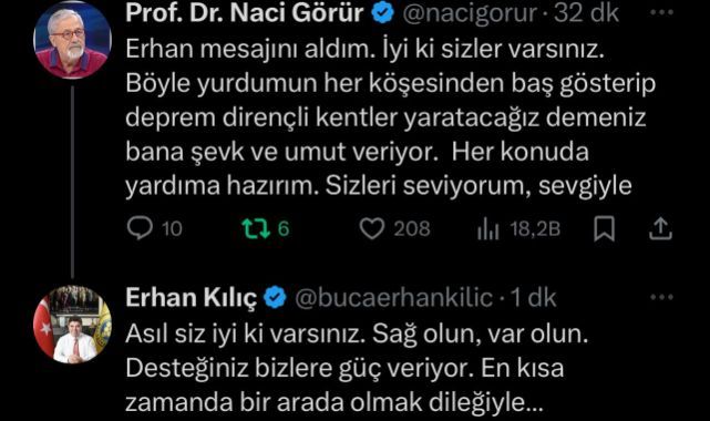 Başkan Kılıç’ın gönderisine yanıt veren Prof. Dr. Naci Görür ise “Erhan mesajını aldım. İyi ki sizler varsınız. Böyle yurdumun her köşesinden baş gösterip deprem dirençli kentler yaratacağız demeniz bana şevk ve umut veriyor. Her konuda yardıma hazırım. Sizleri seviyorum” dedi.