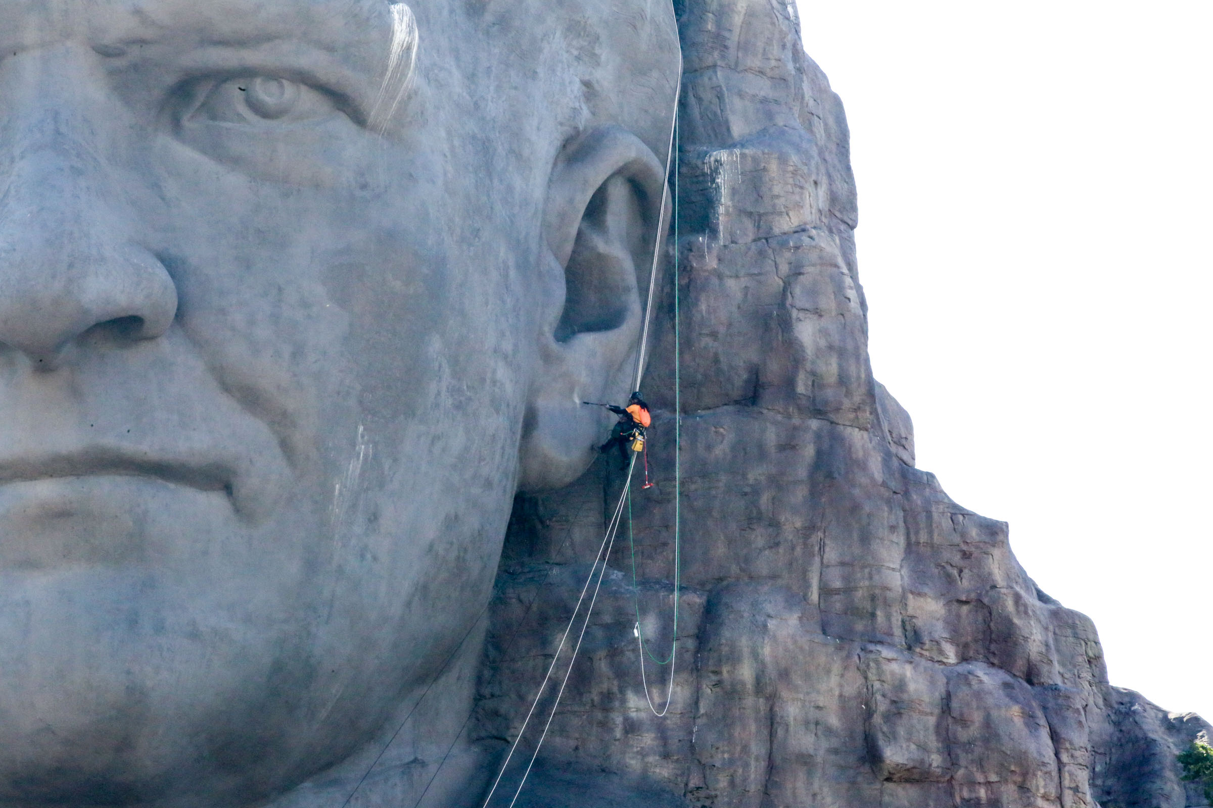 Maskın çeşitli bölgelerine iplerle inen dağcılar, ilk olarak inceleme ve tespit çalışması yaptı. Konum itibari ile yoğun güneş, rüzgar ve yağışa maruz kalan maskın yüzeyindeki hasarlar kontrol edilerek raporlandı. İnceleme sonucunda bölgede yaşanan yoğun kuş trafiği nedeniyle maskın kaş ve kulak bölgelerinde yuvalar tespit edildi.42 metrelik dev maskın bazı bölgelerinde aşırı sıcaklar nedeniyle oluşan yıpranmalar ve yırtıcı kuşların yiyecek artıkları ve neden olduğu kirlenme özel kimyasallarla temizlendi. Yürütülen çalışmada kuşlara zarar verilmemesine dikkat edildi.