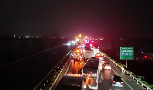 Anadolu Otoyolu’nun Sakarya geçişinde 16 aracın karıştığı zincirleme trafik kazasında, 4’ü ağır olmak üzere toplam 13 kişi yaralandı. Kazanın, yol kenarında yakılan lastiklerden çıkan yoğun duman sebebiyle meydana geldiği öne sürüldü. Meydana gelen kaza alanı havadan da görüntülendi.