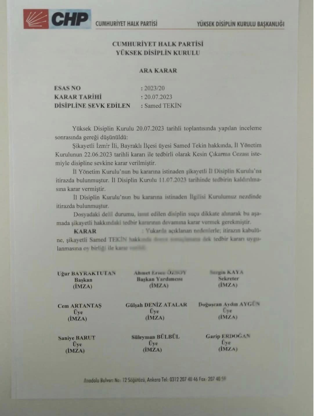 “İl disiplin kurulunun, hakkımdaki “tedbirin kaldırılması kararı” Chp Bayraklı ilçe yönetiminin itirazı nedeniyle Yüksek Disiplin Kuruluna gönderilmiş olup yüksek disiplin kurulu hakkımdaki “tedbirin kaldırılması kararını” iptal etmiştir. Seçilmiş olduğum Körfez mahallesi delegeliğim en azından 11 Ağustostaki İzmir İl Disiplin kurulunun kararına kadar düşürülmüştür. Süreci; Hiç bir haksızlık karşısında susmayan, asla sinmeyen ve korkmayan Kemalist, devrimci bir Chp li hukukçu olarak sonuna kadar takip edeceğimi, Genel Başkan Sayın Kemal KILIÇDAROĞLU’nun sık sık kullandığı “Haksızlık karşısında susan dilsiz şeytandır!” sözünü hatırlatarak kamuoyuna ve değerli Cumhuriyet Halk Partililere saygıyla bildiririm…”