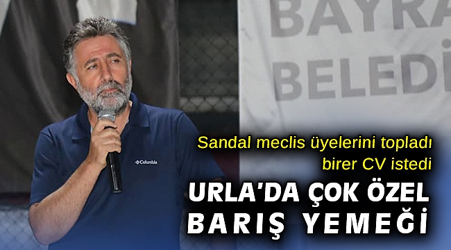 Bayraklı Belediye Başkanı Serdar Sandal, meclis üyeleri arasındaki huzursuzluğa son vermek amacıyla iddiaya göre Urla’da gizli bir yemek düzenledi. Sadece CHP’li meclis üyelerinin davetli olduğu yemekte, meclis üyelerinden Belediyede işe başlatılmak üzere birer CV istedi. CHP’li 3 meclis üyesinin katılmadığı yemek ise barış yerine ilçede daha da büyük tepkilere neden oldu.