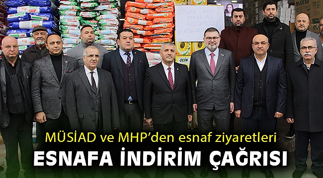 MHP İzmir İl Başkanı Veysel Şahin ile MÜSİAD İzmir Şube Başkanı Bilal Saygılı, Gıda Çarşısı esnafını ziyaret etti. Döviz kurundaki gerileme sonrası fiyatlarında indirim yapan ve bu konuda hazırlıklarını sürdüren toptanı esnafıyla iş yerlerinde sohbet eden Şahin ve Saygılı, indirim yapanlara teşekkür etti."Haydi Türkiye Şimdi İndirim Zamanı" kampanyası kapsamında esnaf ziyareti gerçekleştirdiklerini söyleyen MÜSİAD İzmir Şube Başkanı Bilal Saygılı, Türk Lirası'nın güçlenmesi için esnafın da halkın yanında olması gerektiğini vurgulayarak, "Esnafımızla hemhal olup onlarla halkımıza destek olmanın mutluluğunu yaşıyoruz. Şunu da özellikle belirtmek isterim, roket hızıyla yükselen fiyatların paraşüt hızıyla aşağıya inmesini asla kabul etmeyiz. Devletin iradesini güçlü bir şekilde ortaya koyması ve dövizin inmesi sonucunda esnafımızın, tüccarımızın, sanayicimizin, ham madde üreticimizin de tek yürekle fiyatları eski seviyesine getirmesi milli bir görevdir. Bu görevin layıkıyla yapılacağına inancımız tamdır" dedi.