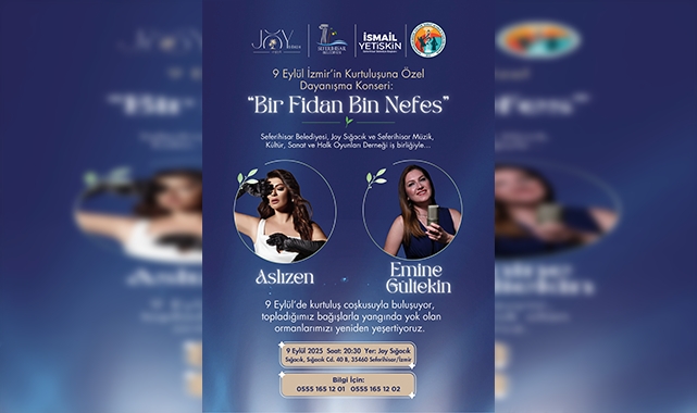 Seferihisar Belediyesi, Joy Sığacık ve Seferihisar Müzik, Kültür, Sanat ve Halk Oyunları Derneği iş birliğiyle 9 Eylül’de orman yangınlarında zarar gören alanlar için anlamlı bir dayanışma konseri düzenleniyor. “Bir Fidan Bin Nefes” başlığıyla gerçekleştirilecek etkinlikte Seferihisarlılar hem kurtuluş gününün coşkusunu hem de doğaya nefes olmanın gururunu yaşayacak.